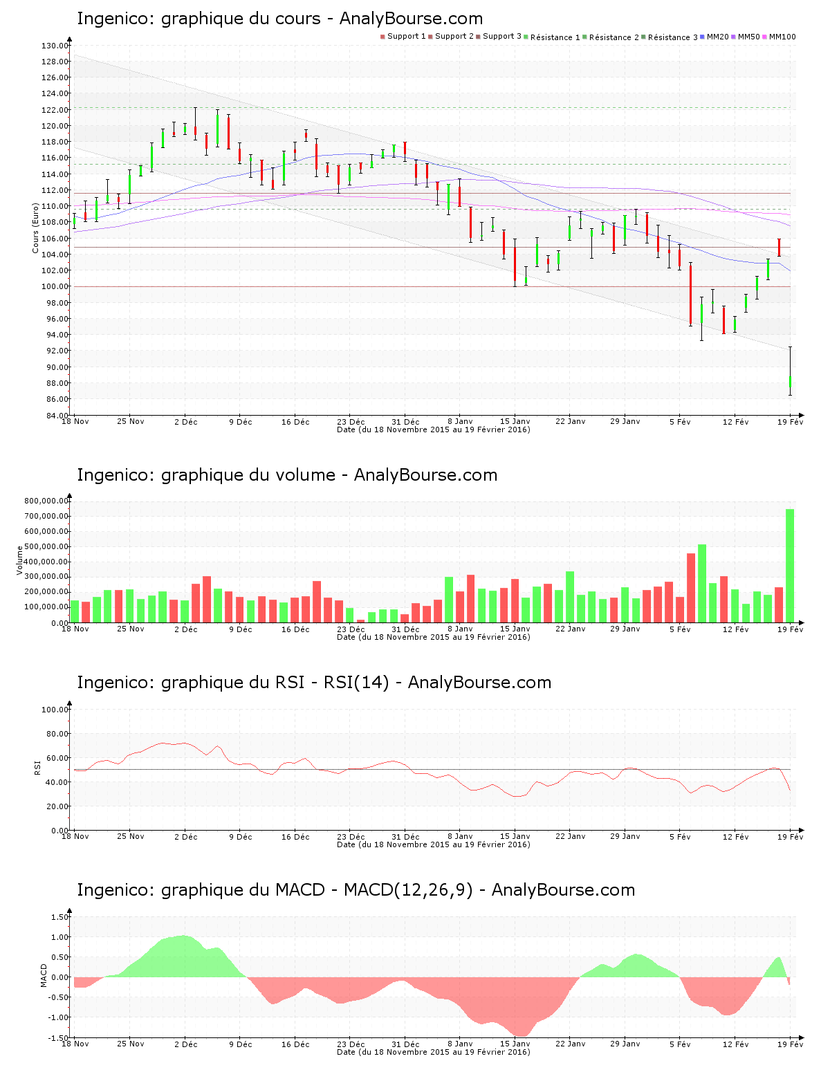 Concernant le RSI, on relève qu’il est en régression ce jour. Il a basculé au niveau de vente, ce qui peut dévoiler un départ d’une orientation décroissante à longue échéance pour la valeur Ingenico. Le MACD est ce vendredi 19 février en forte décroissance. Le MACD est passé en territoire négatif aujourd’hui, ceci pourrait caractériser un commencement de tendance décroissante sur la durée pour la valeur Ingenico.