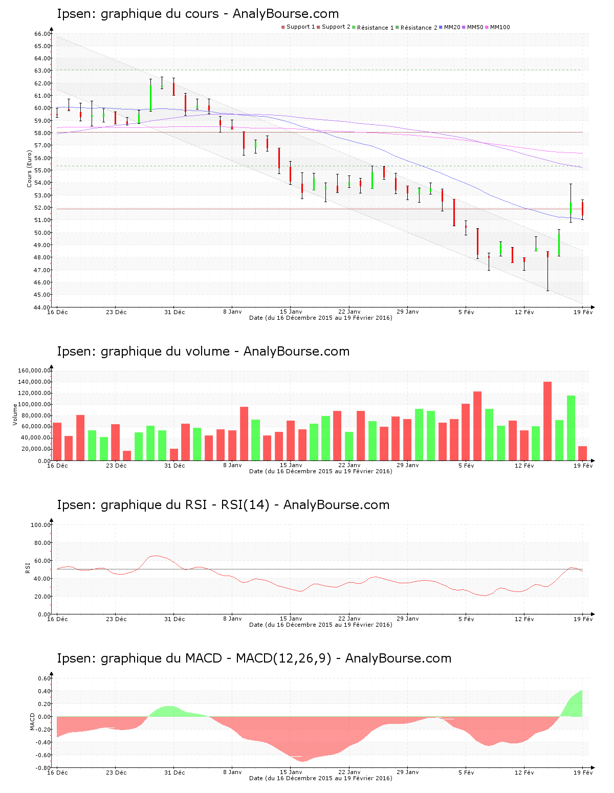 L’indicateur RSI est ce vendredi 19 février en décroissance. Il a basculé dans le niveau de vente, ce qui pourrait montrer une amorce de tendance décroissante à longue échéance pour la valeur Ipsen. On repère que l’indicateur MACD est en substantielle augmentation aujourd’hui. Ce dernier représente à présent une évolution du cours en conséquente progression sur le moyen-court terme.