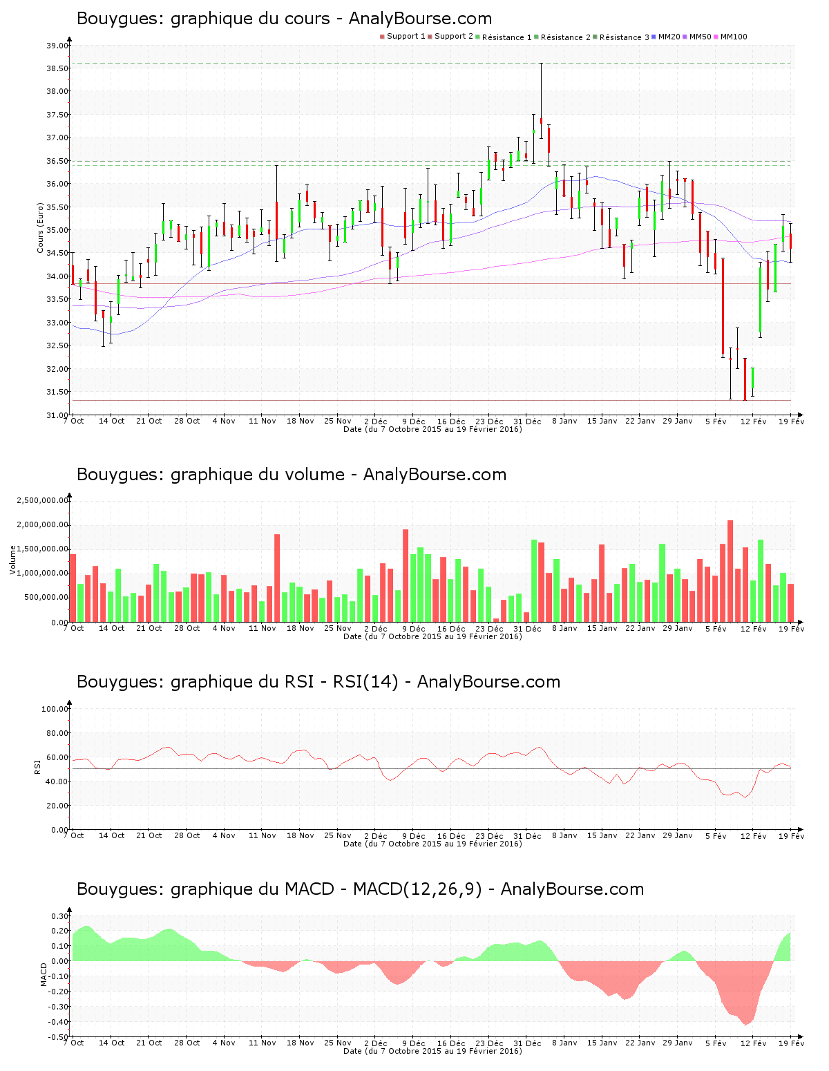 Côté indicateurs, l’indicateur MACD est en solide hausse ces cinq derniers jours de cotations. Ce dernier indique dorénavant une évolution du cours en substantielle hausse à moyen terme. L’indicateur MACD est passé en terrain positif mercredi dernier, ceci peut ébaucher un engagement d’une évolution en hausse sur le long terme pour Bouygues. De son côté, ceci fait finalement 77 séances de cotations que la moyenne mobile sur cinquante jours de la valeur Bouygues se localise au-delà de sa moyenne mobile sur cent jours. Enfin, concernant le RSI, on repère qu’il est en progression ces dernières séances. C’est maintenant dans le niveau neutre que ce dernier se positionne.