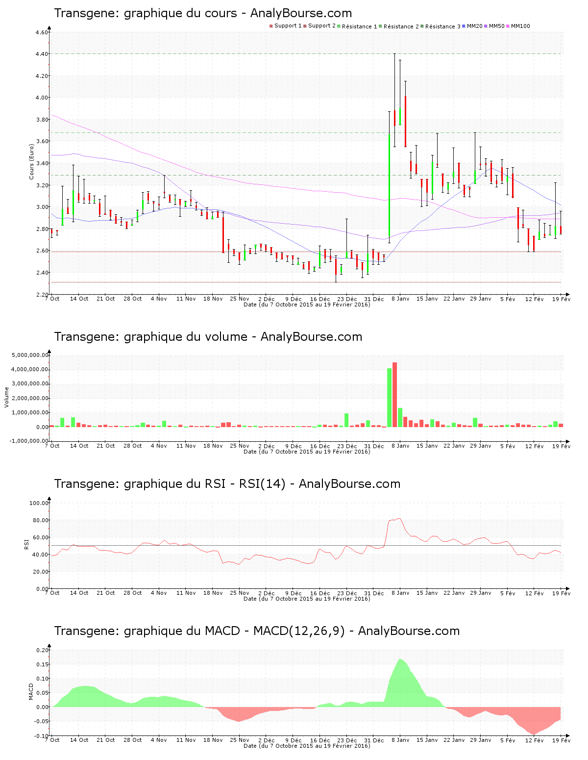 Pour les indicateurs, on repère que l’indicateur MACD est en grande croissance ces cinq dernières séances. C’est cependant toujours une trajectoire du cours en diminution que ce dernier représente à moyen terme. De son côté, la moyenne mobile sur 20 jours de l’action Transgene est positionnée au-delà de sa moyenne mobile sur 50 jours, qui est elle-même placée au-delà de sa moyenne mobile sur 100 jours. L’action dévoile donc un développement haussier sur le long terme. Enfin, on repère que le RSI est assez stable ces derniers jours. Ce dernier se place donc encore au niveau de vente.