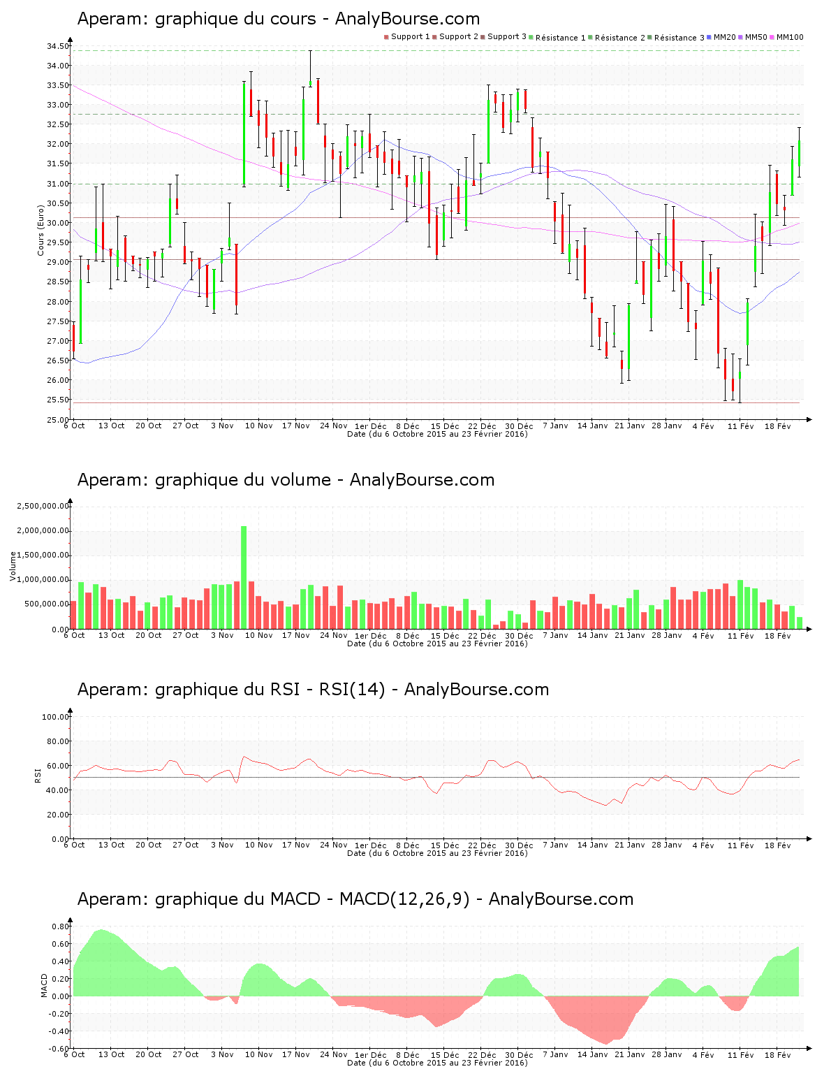 La valeur Aperam cote à son montant du lundi 4 janvier 2016. Avec un volume à 13:56 d’environ 234000 actions échangées, incarnée par un comportement haussier de 1.55%, la valeur Aperam montre ce mardi 23 février une pression acheteuse. L’action atténue son développement croissant. Aperam se valorise à présent à 32.080 €. Avec un mouvement haussier de 4.22%, le résultat était franchement encourageant hier pour la valeur. Aperam affiche une certaine fébrilité ce jour, le titre naviguant dans un range de 4.08%. Le mouvement du titre le mène maintenant près de la résistance des 32.750 €.