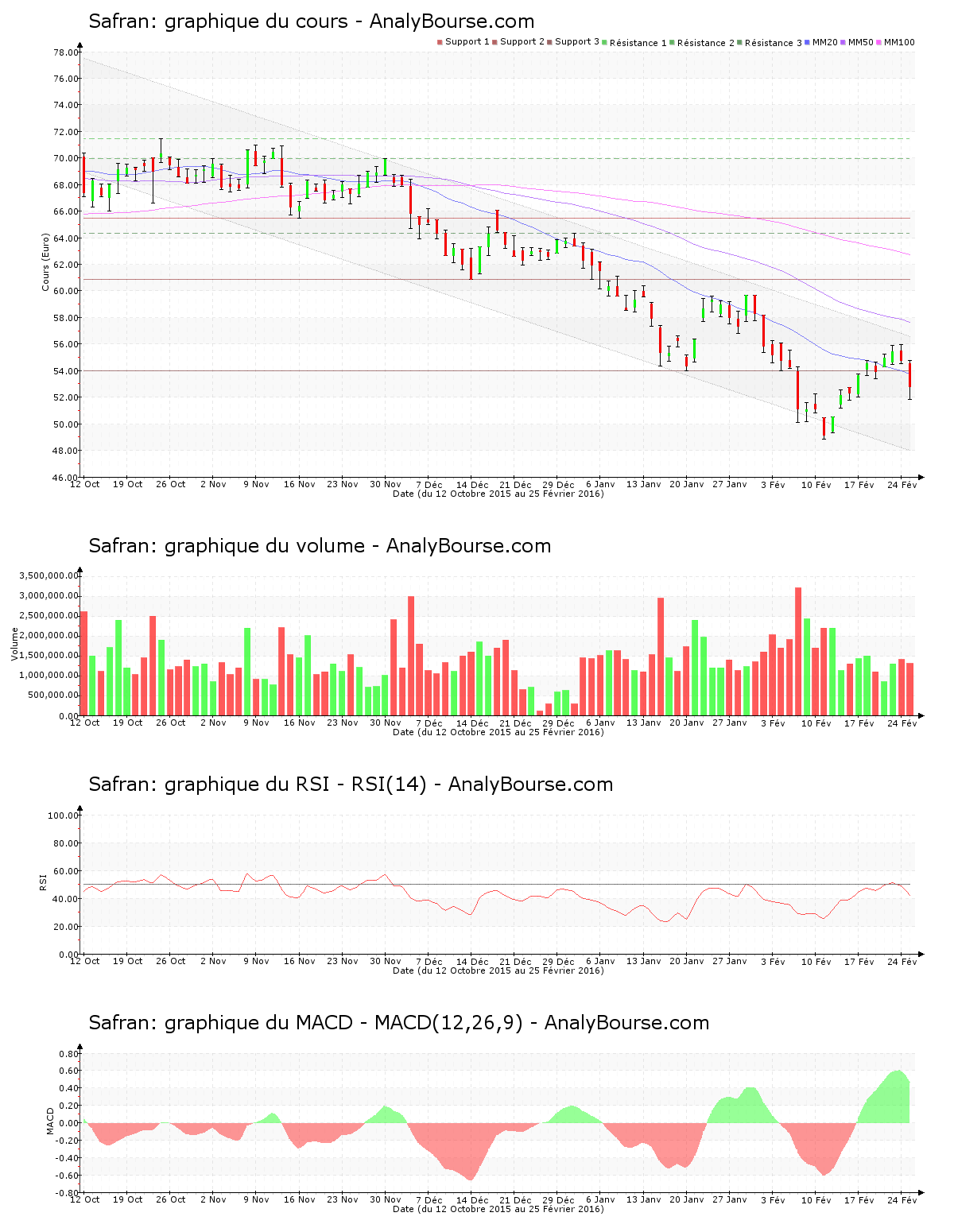 Avec sensiblement 1.3 million d’actions échangées à 14:28, l’action Safran accentue son développement baissier. Avec un parcours baissier de 3.62%, le constat est très défavorable pour la valeur. Passant de 54.760 € à 52.780 € ce jour, l’action chute finalement de 1.980 €. Quantifiée par un cours en décroissance de 1.16%, la volonté d’achat sur Safran hier était déjà faible. Le cours a franchi le support des 54.000 € ce jeudi 25 février. Le support suivant se localise à 48.870 €. Safran évolue ce jeudi dans des limites de 5.61%, dévoilant une relative nervosité sur le cours.
