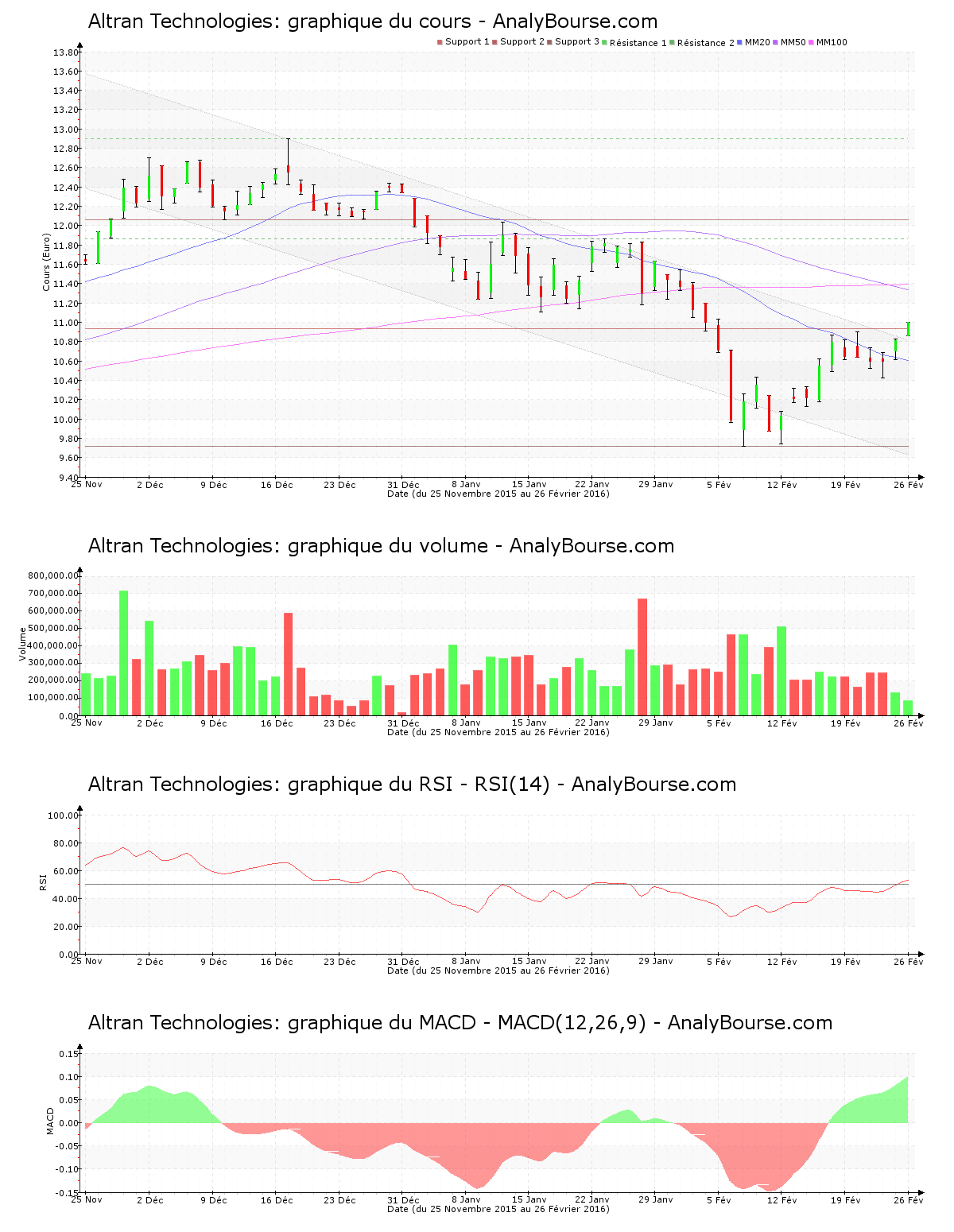 Du côté des indicateurs, l’indicateur RSI est aujourd’hui en progression. Il est passé au niveau d’achat, ceci peut suggérer un début de tendance haussière pour l’action Altran Technologies à long terme. On constate que le MACD est stable ce vendredi 26 février. Il représente ainsi toujours une évolution du cours en importante croissance sur le moyen terme.