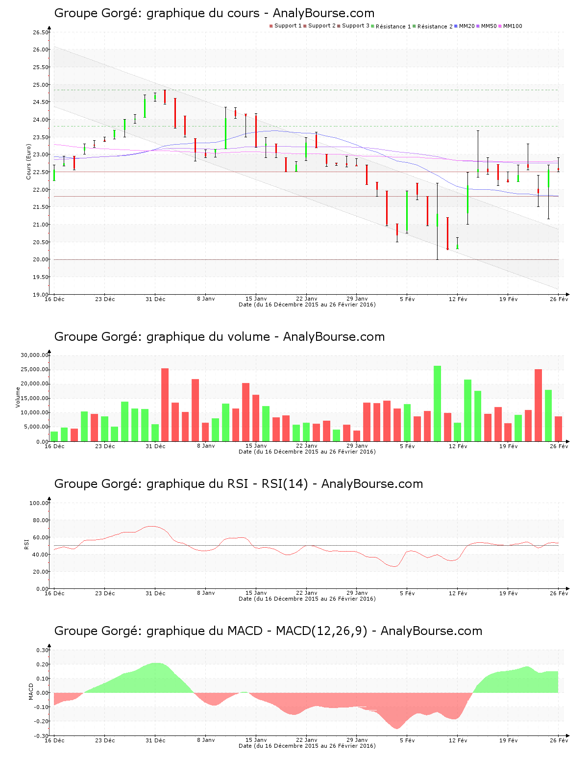 |Concrétisée par un parcours haussier de 1.53%, l’action Groupe Gorgé connaît cette semaine une pression acheteuse. Depuis la semaine dernière, elle ralentit son mouvement en hausse. Commençant à 22.210 € pour parvenir à 22.550 € cette semaine, Groupe Gorgé augmente à présent de 0.340 €. Concrétisée par un cours en augmentation de 8.82%, la demande sur l’action la semaine dernière était extrêmement grande. La valeur navigue ces derniers jours dans des limites de 10.12%, présentant une ferme fébrilité sur le cours. La valeur se positionne très au-dessus de son canal. Elle ne varie effectivement plus dans le canal à l’intérieur duquel elle se cantonnait ces dernières semaines.