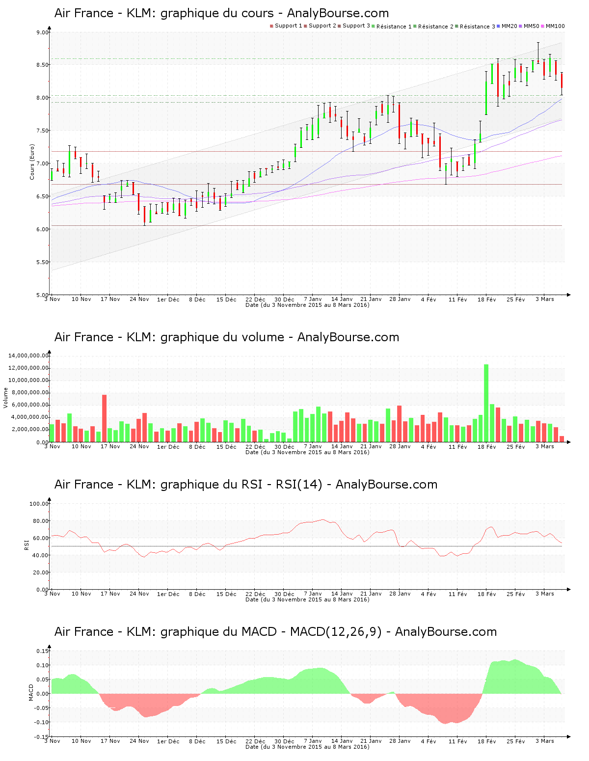 Pour l’indicateur MACD, on remarque qu’il est en régression ce mardi. L’indicateur MACD est passé du côté négatif ce mardi 8 mars, ceci pourrait révèler un engagement d’une évolution baissière sur le long terme pour la valeur Air France – KLM.