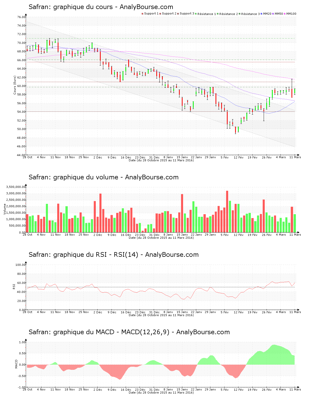 Ces informations constituent une analyse technique de la valeur Safran au samedi 12 mars 2016. Cette analyse peut être invalidée par des éléments plus récents, et ne constitue en aucune manière une incitation d’achat ou de vente sur les marchés financiers. Le lecteur reste libre et responsable de l’interprétation et de l’usage faits de ces informations.
