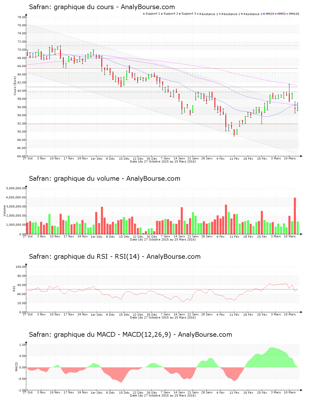 Concernant les indicateurs, on note que le RSI est en progression ce mardi 15 mars. Il a basculé dans le niveau d’achat, ceci peut représenter un début d’une orientation haussière à long terme pour la valeur Safran.