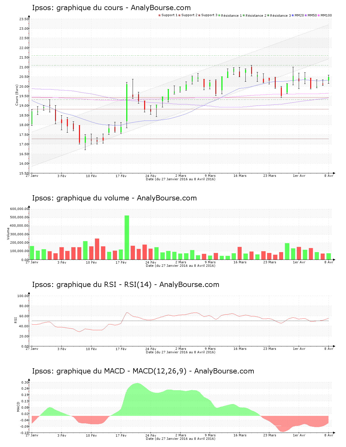 Concernant les indicateurs, la moyenne mobile sur cinquante jours de l’action Ipsos se situe dorénavant en-dessous de sa moyenne mobile sur cent jours depuis 35 séances. Pour sa part, l’indicateur MACD est ces dernières séances en augmentation. Il suggère malgré ceci encore une tendance du cours en substantielle diminution sur le moyen terme. Pour finir, l’indicateur RSI est stable cette semaine. Ce dernier se situe donc encore dans le niveau d’achat.