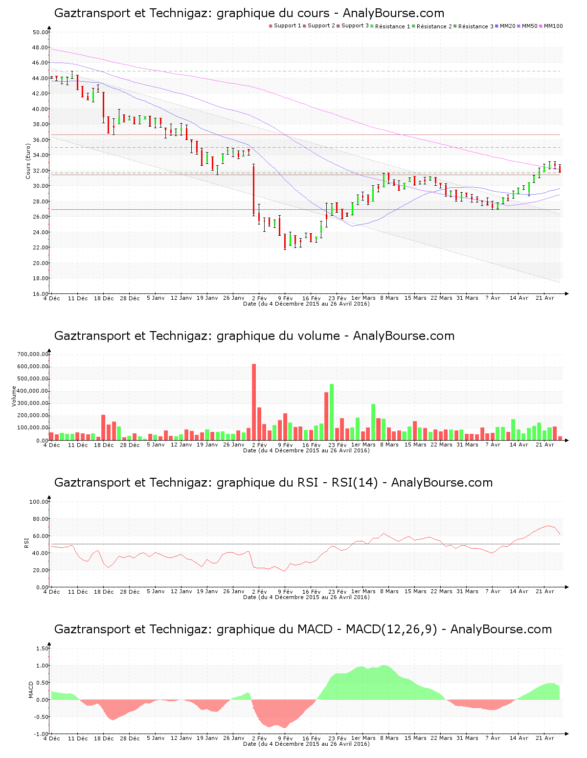Avec un volume à 14:54 d’environ 30000 titres échangés, imprégnée par un mouvement baissier de 2.58%, la volonté d’achat sur l’action Gaztransport et Technigaz ce mardi 26 avril est encore particulièrement faible. Animée par un cours baissier de 0.67%, l’intention d’achat sur la valeur hier était déjà faible. Gaztransport et Technigaz se revend à présent à 31.750 €. La valeur accentue par conséquent son comportement décroissant. Remarquons, avec un pourcentage de 3.05% espaçant ce jour le plus haut du plus bas, des échanges assez instables sur Gaztransport et Technigaz. Le cours évolue à présent à proximité du support des 31.410 €.