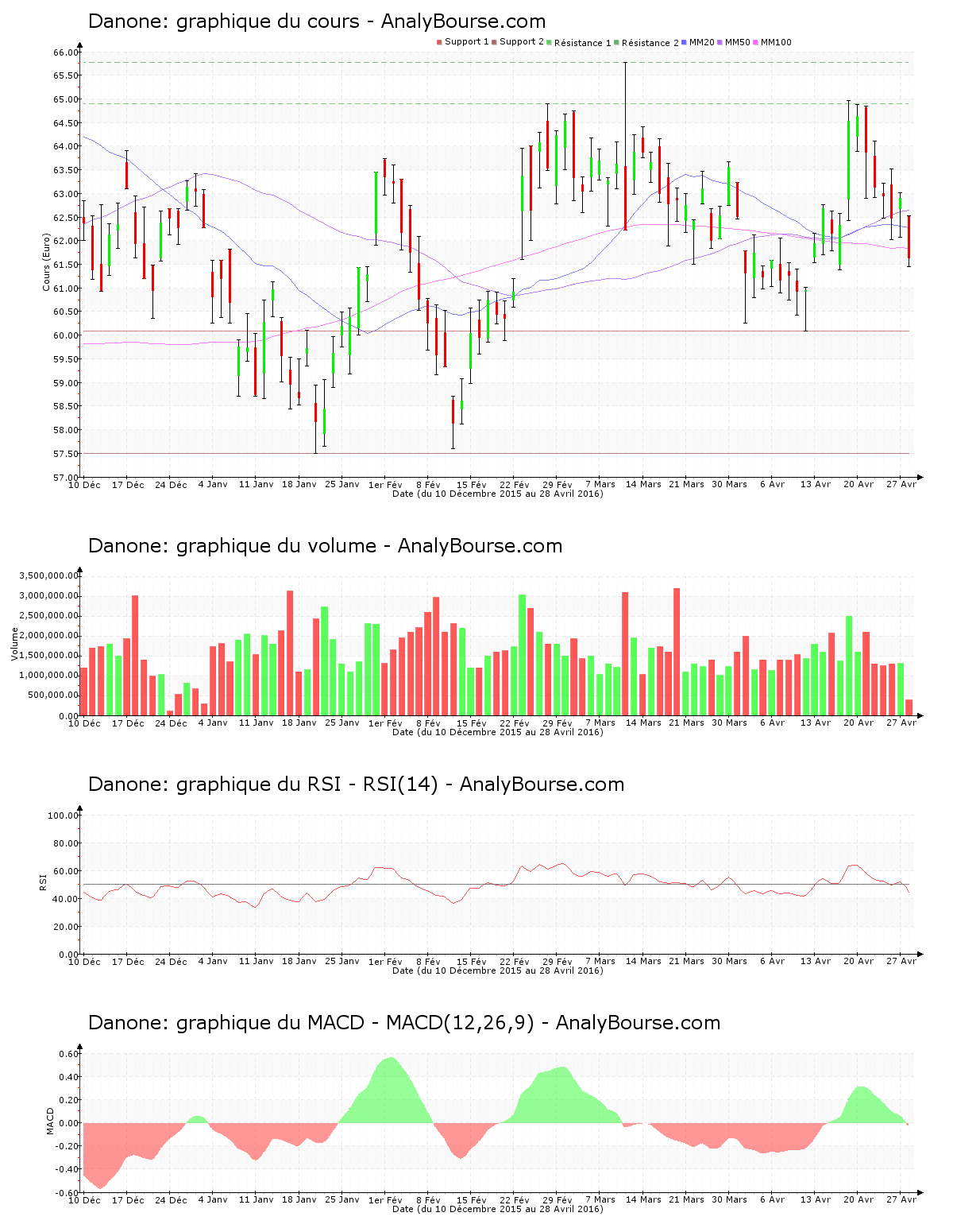 Danone subit ce jeudi 28 avril une pression vendeuse, illustrée par un parcours baissier de 2.00%, dans un volume d’approximativement 400000 titres échangés à 12:27. L’action atteint finalement un montant de 61.640 €. Danone connaissait par contre hier une pression acheteuse, affectée par un parcours haussier de 0.67%. L’action Danone se retourne donc un peu aujourd’hui. Le mouvement du titre le mène désormais près du support des 60.080 €.