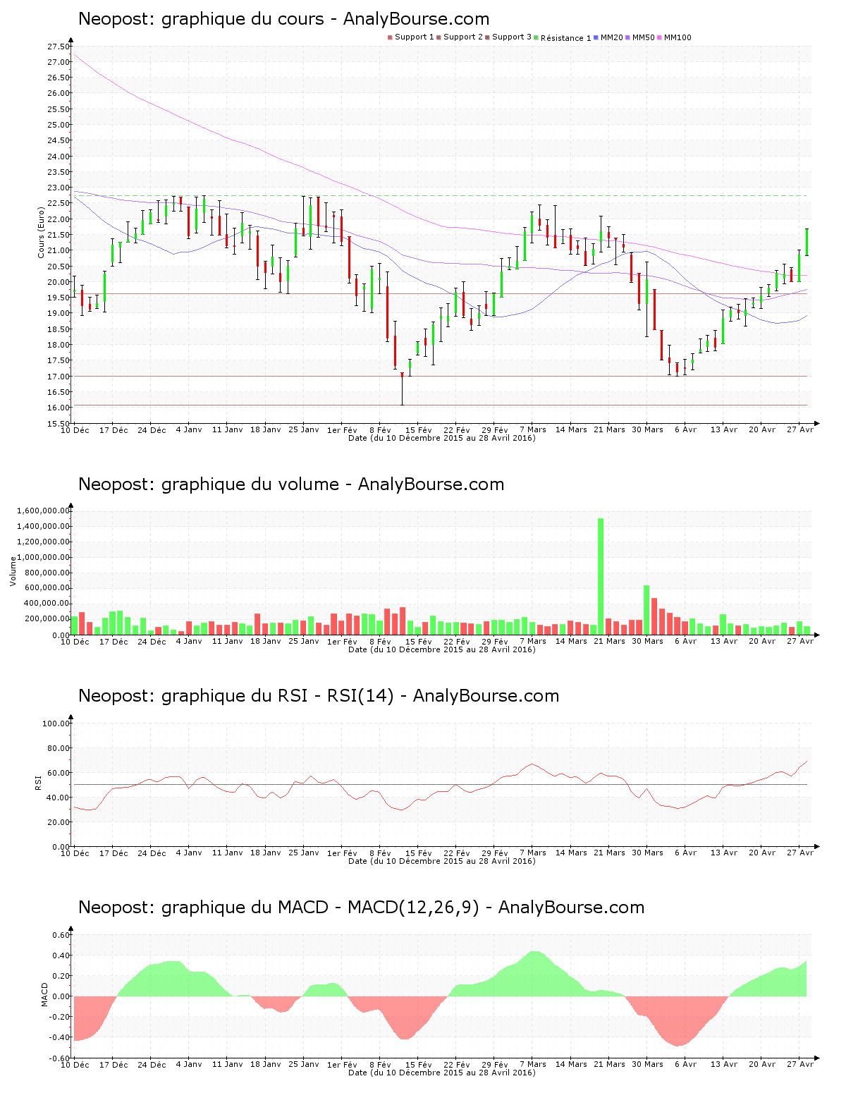Dans un volume d’approximativement 108000 actions échangées à 12:27, avec un cours haussier de 3.84%, le résultat est encore très encourageant ce jeudi pour la valeur Neopost. Elle était déjà hier particulièrement demandée, avec un mouvement en grande progression de 4.30%. La valeur bondit maintenant de 0.800 €, démarrant à 20.860 € pour arriver à 21.660 €. C’est la première fois depuis plus de 34 jours que la valeur Neopost passe ce seuil. Le parcours du cours l’amène maintenant proche de la résistance des 22.740 €. Neopost affiche des échanges assez fébriles ce jeudi, le titre évoluant dans un range de 4.18%.