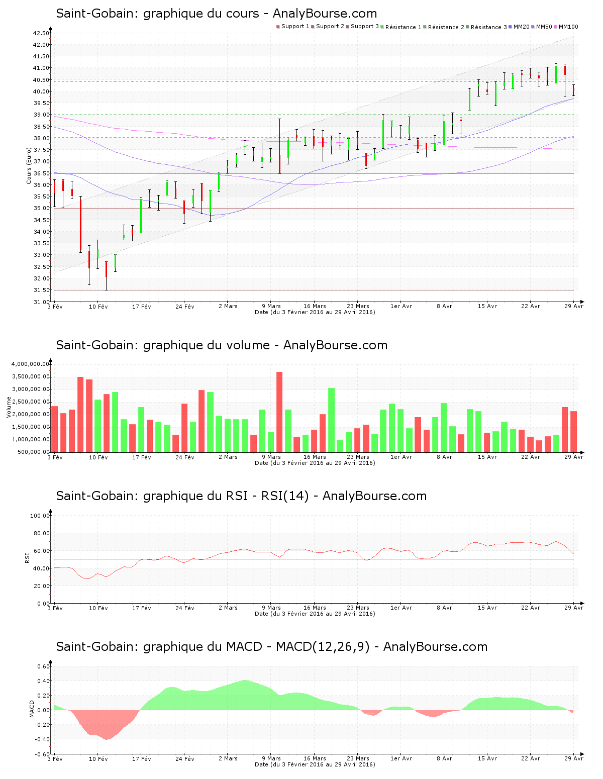 En ce qui concerne les indicateurs, la moyenne mobile sur 50 jours de la valeur Saint-Gobain se place au-delà de sa moyenne mobile sur 100 jours depuis lundi dernier. La moyenne mobile sur 20 jours de la valeur Saint-Gobain est située au-delà de sa moyenne mobile sur 50 jours, qui est pour sa part localisée au-delà de sa moyenne mobile sur 100 jours. Sur une longue période, l’action présente donc un cours haussier. La moyenne mobile sur 20 jours de la valeur Saint-Gobain se situe maintenant au-dessus de sa moyenne mobile sur 50 jours depuis 34 séances. De son côté, le MACD est ces cinq derniers jours de cotations en vigoureuse diminution. C’est finalement une tendance du cours en décroissance que ce dernier dévoile à moyen-court terme. Le MACD est passé en territoire négatif hier, ce qui pourrait représenter une ébauche d’une évolution décroissante à longue échéance pour Saint-Gobain. On repère que l’indicateur RSI est en régression ces derniers jours. Il se positionne néanmoins encore dans le niveau d’achat.