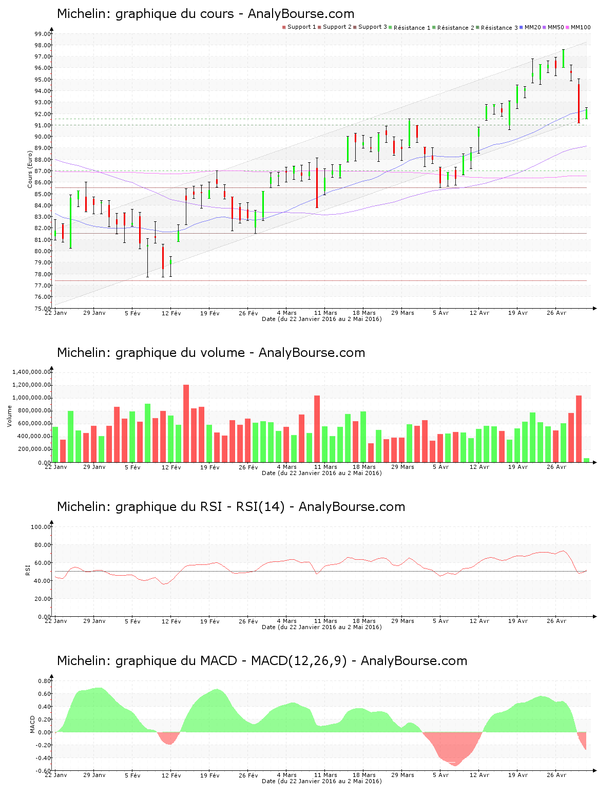 Le bilan est positif aujourd’hui pour Michelin, avec un comportement haussier de 1.29%, avec un volume à 09:40 d’à peu près 57000 titres échangés. L’action se négocie dorénavant à 92.330 €. Michelin connaissait à l’inverse vendredi dernier une forte pression vendeuse, illustrée par un cours baissier de 4.63%. La valeur Michelin bondit par conséquent avec vigueur ce lundi 2 mai. Le titre a franchi la résistance des 91.540 € ce lundi 2 mai.