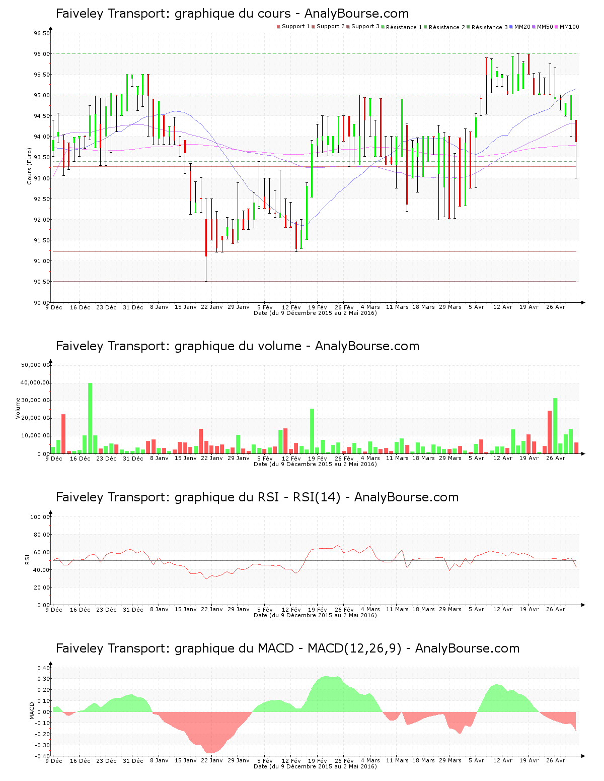 Du côté des indicateurs, concernant le MACD, on remarque qu’il est en ferme baisse aujourd’hui. Il représente désormais une tendance du cours en substantielle baisse sur le court-moyen terme. En ce qui concerne l’indicateur RSI, on observe qu’il est en diminution ce lundi 2 mai. Il est passé dans le niveau de vente, ceci peut indiquer un prémice d’une évolution en régression à long terme pour la valeur Faiveley Transport.