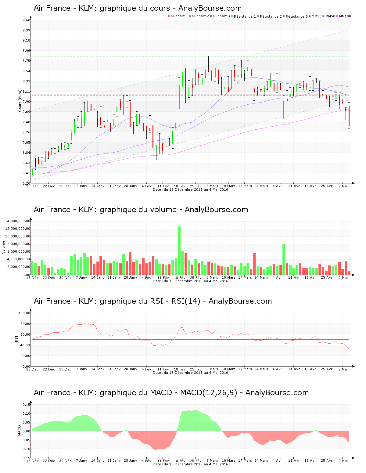 La valeur Air France – KLM n’avait pas dépassé ce niveau depuis le mercredi 17 février 2016. La valeur Air France – KLM est toujours ce jour attaquée, avec un développement en vigoureuse régression de 4.03%, avec 836000 actions échangées à 09:34. Animée par un mouvement baissier de 2.16%, la sollicitation sur l’action hier était déjà faible. Air France – KLM décroche dorénavant de 0.310 €, démarrant à 7.700 € pour se rendre à 7.390 €. Le mouvement décroissant s’accentue ainsi aujourd’hui pour la valeur. Le titre oscille maintenant à proximité du support des 7.180 €. La valeur se développe ce mercredi 4 mai dans des limites de 7.36%, ce qui montre une conséquente volatilité sur le cours.