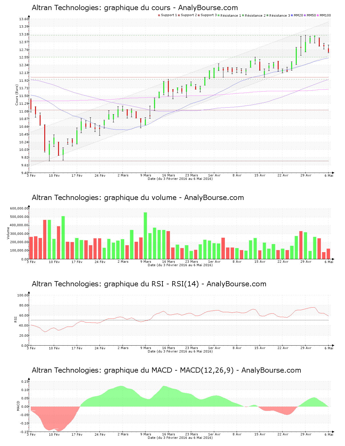 En ce qui concerne les indicateurs, la moyenne mobile sur vingt jours de la valeur Altran Technologies se place au-dessus de la moyenne mobile sur cinquante jours, et la moyenne mobile sur cinquante jours se place elle-même au-delà de la moyenne mobile sur cent jours. Le comportement de l’action est ainsi en progression à longue échéance. La moyenne mobile sur vingt jours de l’action Altran Technologies se situe maintenant au-delà de sa moyenne mobile sur cinquante jours depuis 34 séances. Ensuite, concernant l’indicateur MACD, on constate qu’il est en baisse ces cinq derniers jours de cotations. C’est maintenant une évolution du cours plutôt stable que ce dernier indique à moyen terme. L’indicateur MACD est passé en territoire négatif vendredi dernier, ce qui pourrait représenter une base d’une évolution en régression à longue échéance pour Altran Technologies. L’indicateur RSI est ces cinq dernières séances de cotations en diminution. Ce dernier se trouve néanmoins toujours dans le niveau d’achat.