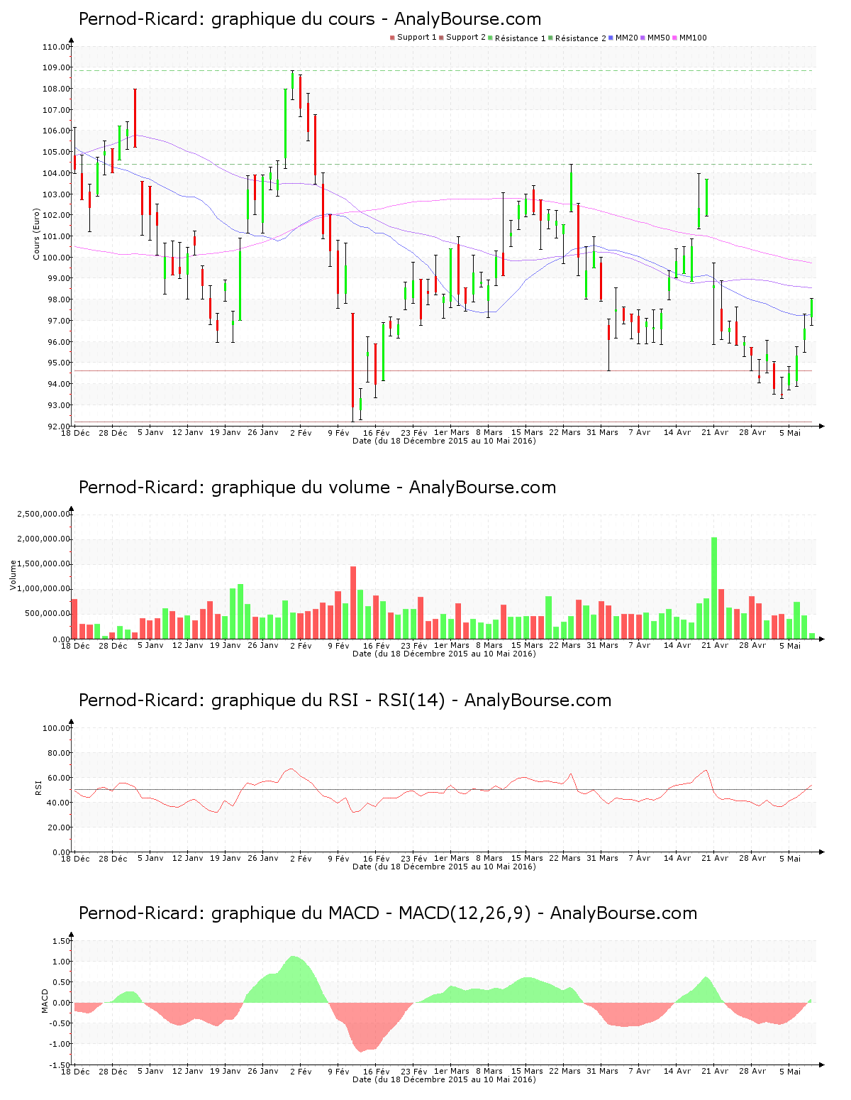 En ce qui concerne les indicateurs, l’indicateur RSI est ce mardi 10 mai en progression. Il a basculé au niveau d’achat, cela pourrait dévoiler un commencement de tendance croissante pour la valeur Pernod-Ricard à long terme. Le MACD est ce mardi en substantielle croissance. Le MACD a basculé en territoire positif ce jour, ceci pourrait représenter un début d’une trajectoire en augmentation à longue échéance pour l’action Pernod-Ricard.
