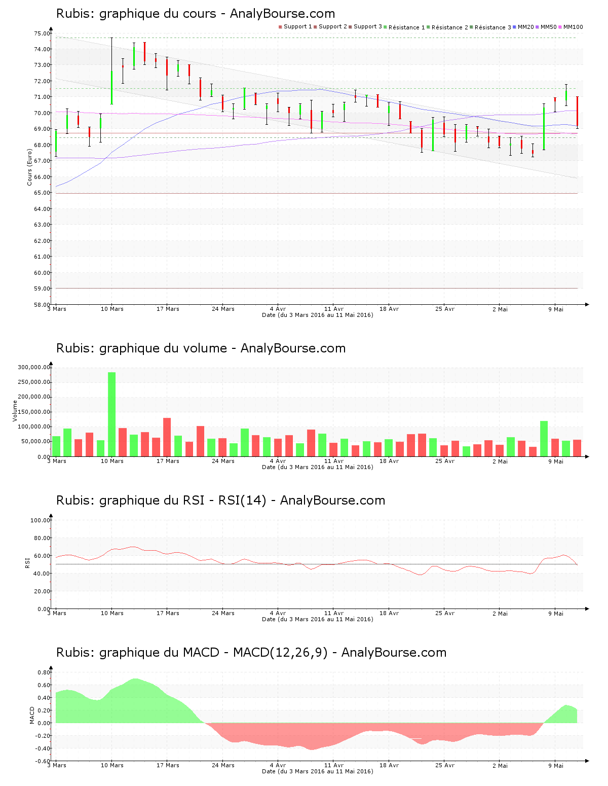 Dans un volume d’à peu près 56000 actions échangées à 15:37, avec un cours en baisse de 3.01%, le parcours est remarquablement mauvais ce jour pour Rubis. La valeur atteint à présent 69.200 €. Rubis supportait à l’opposé hier une pression acheteuse, concrétisée par un cours haussier de 0.89%. La proportion acheteurs/vendeurs se retourne par conséquent avec vigueur ce mercredi. Le cours fluctue finalement près du support des 68.720 €.
