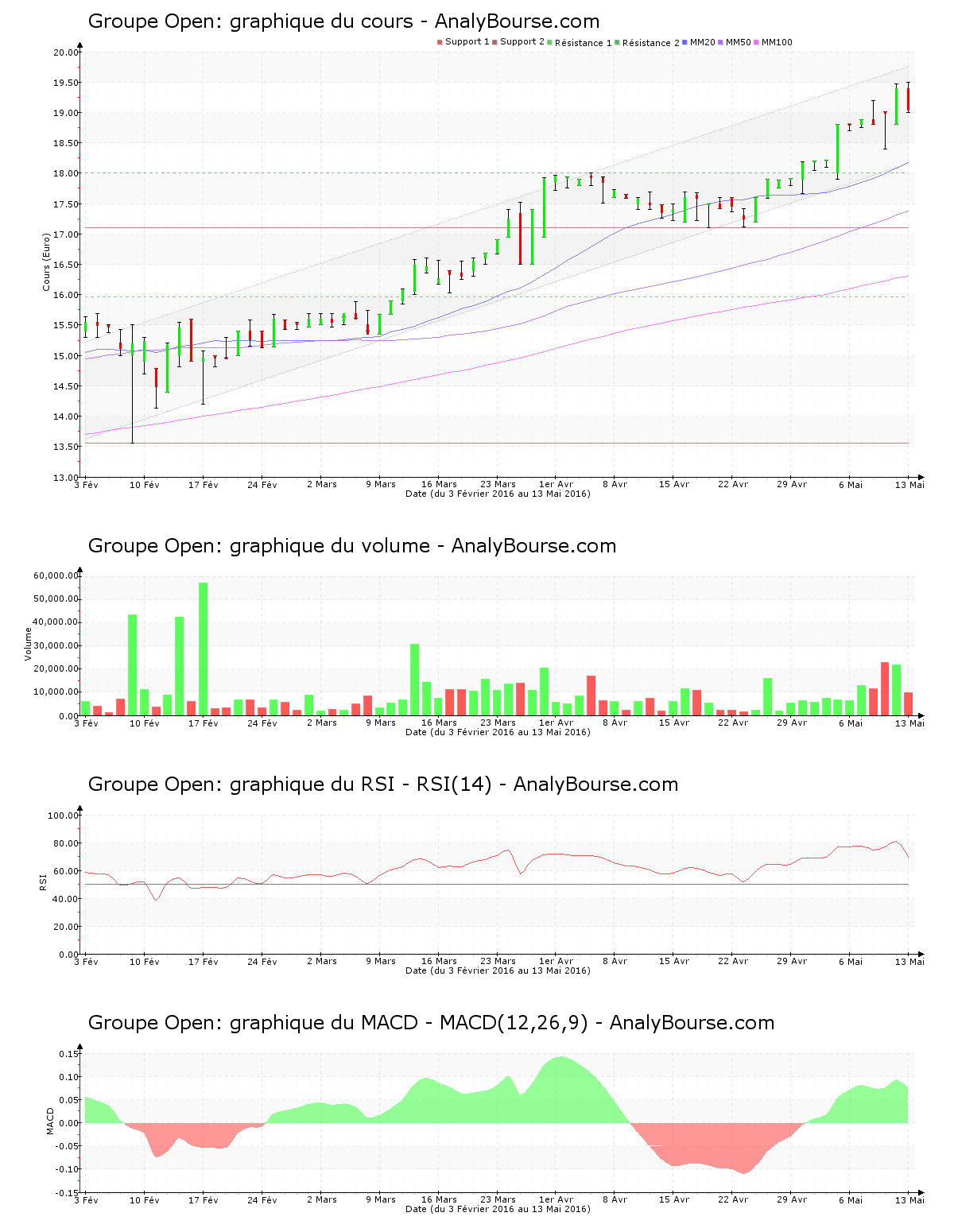 En ce qui concerne les indicateurs, la valeur Groupe Open a une moyenne mobile sur vingt jours située au-dessus de sa moyenne mobile sur cinquante jours, qui est elle-même localisée au-delà de sa moyenne mobile sur cent jours. A longue échéance, l’action enregistre ainsi un parcours haussier. Ceci fait maintenant 63 jours que la moyenne mobile sur vingt jours de l’action Groupe Open se trouve au-delà de sa moyenne mobile sur cinquante jours. L’indicateur RSI est ces dernières séances assez stable. Il se place par conséquent encore dans le niveau d’achat. Le MACD est ces cinq dernières séances plutôt stable. C’est par conséquent encore une tendance du titre en forte progression qu’il révèle à moyen terme.