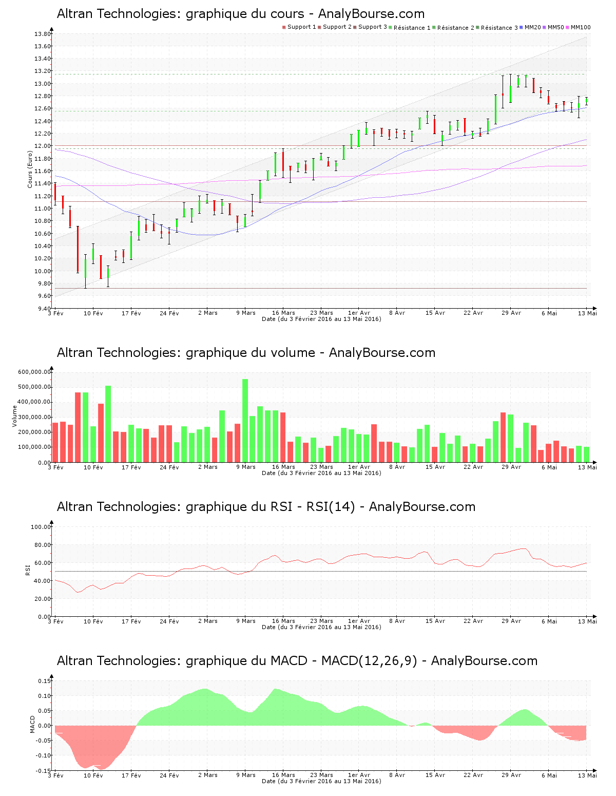 En ce qui concerne les indicateurs, la moyenne mobile sur 20 jours de l’action Altran Technologies est située au-delà de sa moyenne mobile sur 50 jours, qui est pour sa part située au-delà de sa moyenne mobile sur 100 jours. Sur la durée, l’action affiche ainsi un parcours haussier. La moyenne mobile sur 20 jours de l’action Altran Technologies se positionne finalement au-delà de sa moyenne mobile sur 50 jours depuis 39 séances de cotations. De son côté, l’indicateur RSI est ces derniers jours assez stable. Ce dernier se localise ainsi toujours au niveau d’achat. Pour finir, on relève que ces derniers jours le MACD est en diminution. Il signale dorénavant une trajectoire du titre en baisse sur le court-moyen terme.