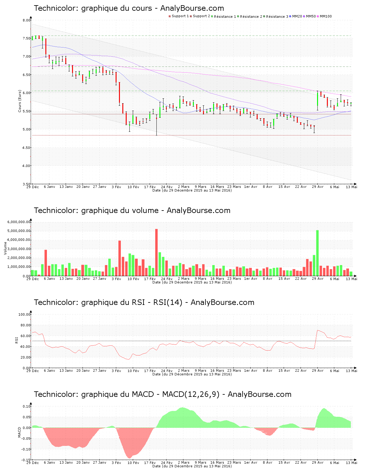 Du côté des indicateurs, la moyenne mobile sur 20 jours de la valeur Technicolor a croisé la moyenne mobile sur 50 jours mercredi dernier. La moyenne mobile sur 50 jours de l’action Technicolor se place finalement en deçà de sa moyenne mobile sur 100 jours depuis 61 jours de cotations. De son côté, on observe que ces derniers jours l’indicateur RSI est stable. Ce dernier se situe ainsi encore au niveau d’achat. Pour finir, on repère que cette semaine l’indicateur MACD est en baisse. Il caractérise désormais une trajectoire du titre assez stable sur le moyen terme.