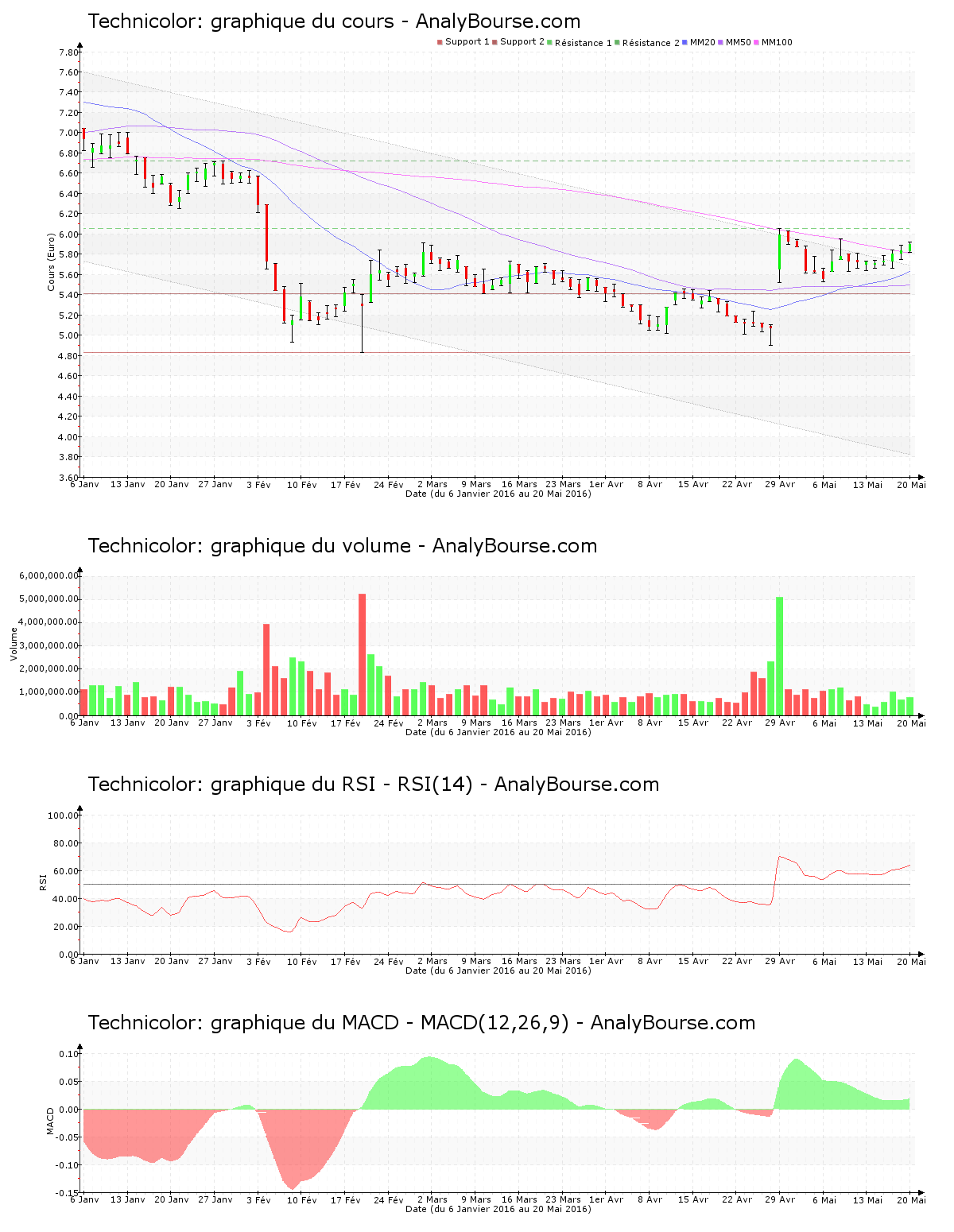 Ces informations constituent une analyse technique de l’action Technicolor au dimanche 22 mai 2016. Cette analyse peut être invalidée par des éléments plus récents, et ne constitue en aucune manière une incitation d’achat ou de vente sur les marchés financiers. Le lecteur reste libre et responsable de l’interprétation et de l’usage faits de ces informations.
