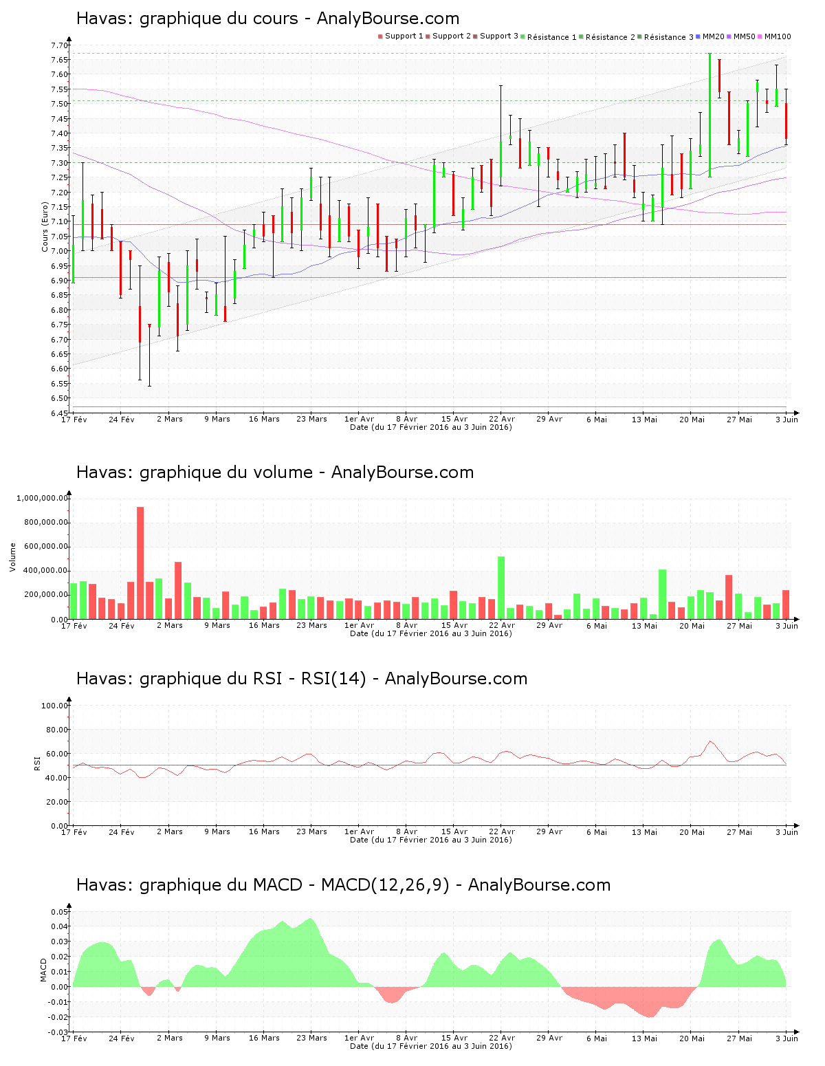 Ces informations constituent une analyse technique de la valeur Havas au dimanche 5 juin 2016. Cette analyse peut être invalidée par des éléments plus récents, et ne constitue en aucune manière une incitation d’achat ou de vente sur les marchés financiers. Le lecteur reste libre et responsable de l’interprétation et de l’usage faits de ces informations.
