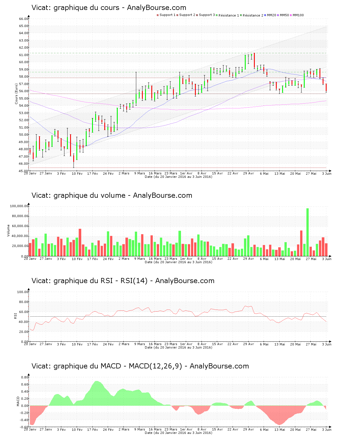 Ces informations constituent une analyse technique de l’action Vicat au dimanche 5 juin 2016. Cette analyse peut être invalidée par des éléments plus récents, et ne constitue en aucune manière une incitation d’achat ou de vente sur les marchés financiers. Le lecteur reste libre et responsable de l’interprétation et de l’usage faits de ces informations.