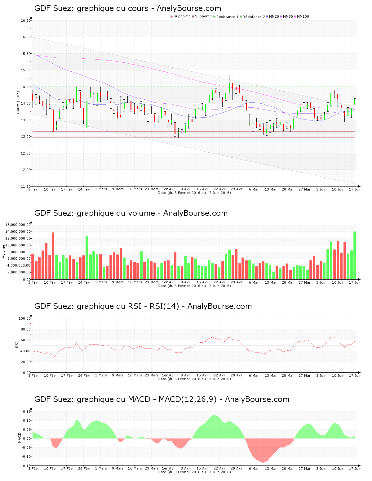 |Le constat est neutre ces cinq dernières séances de cotations pour l’action GDF Suez. Cette dernière se négocie en effet juste à 14.120 €. GDF Suez était au contraire en vigoureuse croissance la semaine dernière, avec un cours en croissance de 4.52%. Remarquons, avec un taux de 5.29% qui éloigne ces dernières séances les extremums, une relative effervescence sur GDF Suez. L’action se situe au-delà de son canal. Elle est en effet sortie par le haut du canal dans lequel elle évoluait ces dernières semaines.