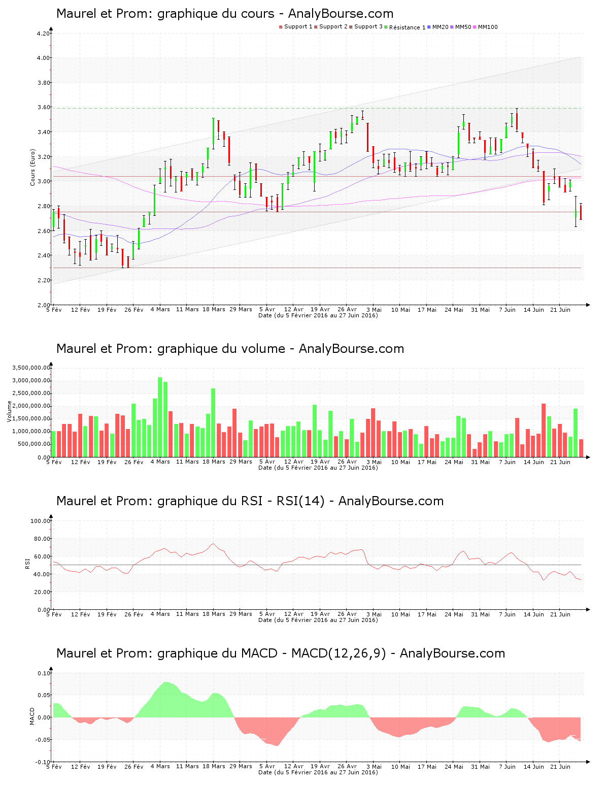 La valeur Maurel et Prom n’a pas passé ce niveau depuis le mardi 1er mars 2016. La valeur Maurel et Prom plonge toujours ce jour, avec un cours en baisse de 2.54%, avec environ 683000 actions échangées à 13:25. Elle était déjà en solide diminution vendredi dernier, avec un comportement baissier de 7.69%. L’action chute finalement de 0.070 €, démarrant à 2.760 € pour parvenir à 2.690 €. Avec un taux de 4.83% qui éloigne les extremums de Maurel et Prom, on repère une relative instabilité aujourd’hui sur le titre. Le cours a franchi le support des 2.750 € ce lundi. Le support suivant se situe à 2.300 €.