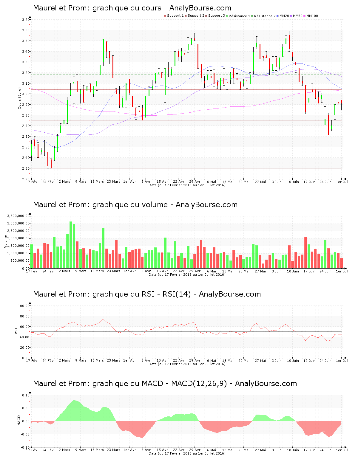 Ces informations constituent une analyse technique de l’action Maurel et Prom au dimanche 3 juillet 2016. Cette analyse peut être invalidée par des éléments plus récents, et ne constitue en aucune manière une incitation d’achat ou de vente sur les marchés financiers. Le lecteur reste libre et responsable de l’interprétation et de l’usage faits de ces informations.