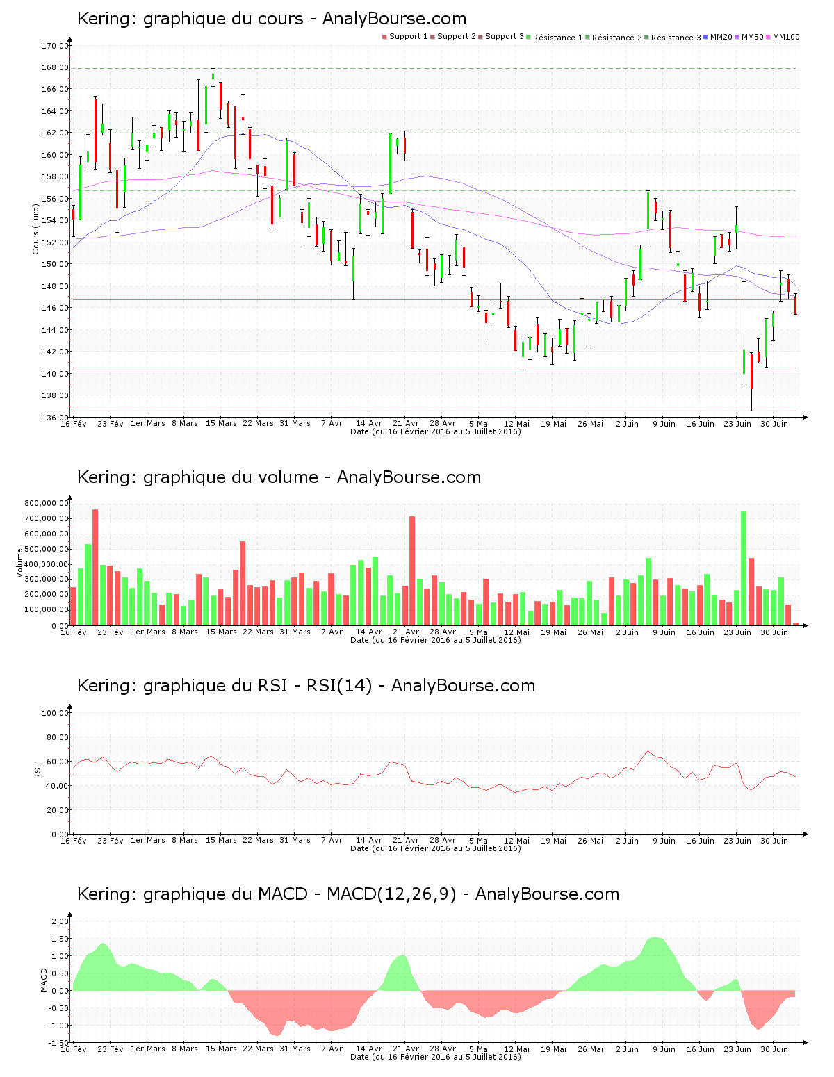 Pour les indicateurs, on remarque que le RSI est en diminution ce mardi 5 juillet. Il a basculé dans le niveau de vente, cela pourrait signaler un début d’une évolution baissière sur une longue période pour la valeur Kering. On repère que ce mardi 5 juillet le MACD est relativement stable. Ce dernier dessine ainsi encore une tendance du titre en importante décroissance sur le moyen terme.