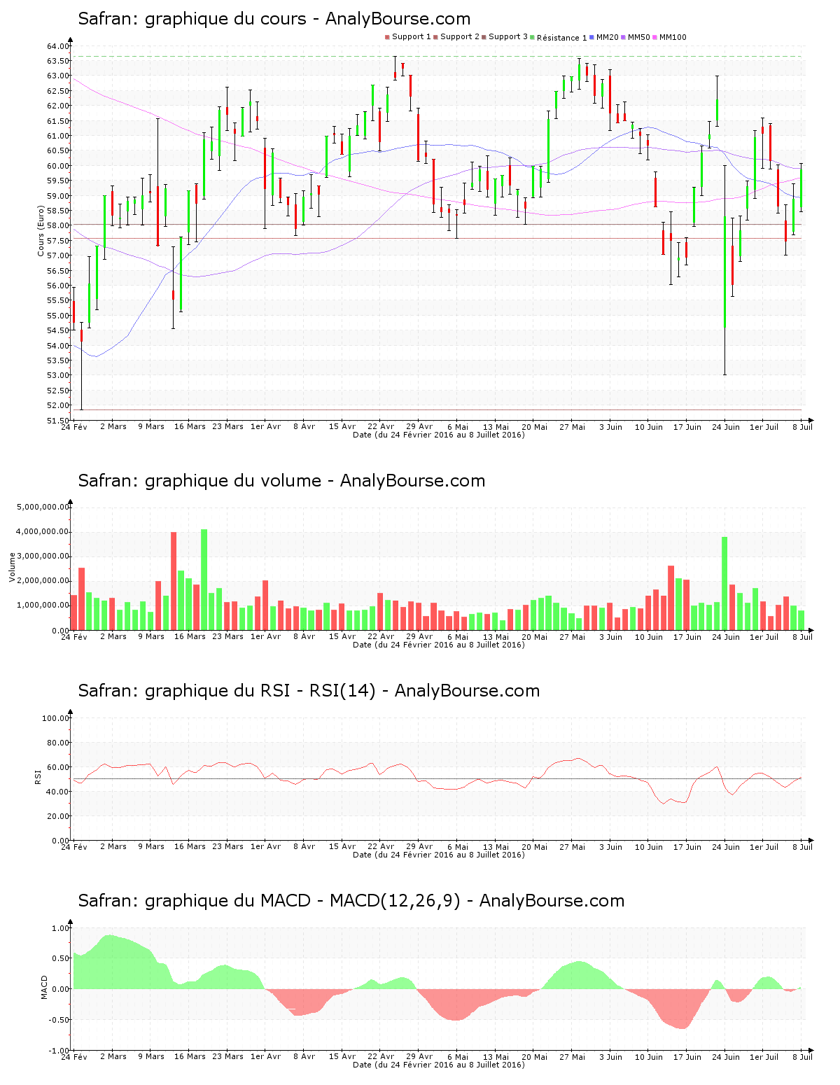 On remarque que l’indicateur MACD est en vigoureuse régression ces dernières séances. C’est cependant encore une évolution du cours en progression qu’il indique à moyen terme. Pour sa part, voilà maintenant 52 jours de cotations que la moyenne mobile sur 50 jours de la valeur Safran se situe au-delà de sa moyenne mobile sur 100 jours. Pour terminer, on constate que le RSI est assez stable ces cinq derniers jours de cotations. C’est donc encore dans le niveau neutre qu’il se trouve.