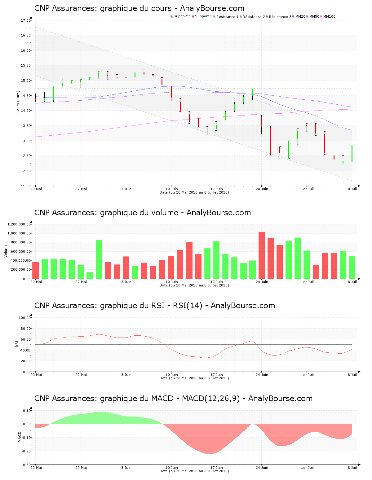 L’action CNP Assurances affiche ces dernières séances une forte pression vendeuse, matérialisée par un développement baissier de 4.81%. Elle s’échange maintenant à 12.850 €. CNP Assurances était stable la semaine dernière, avec un comportement haussier de 0.22%. La valeur reprend ainsi son parcours décroissant. Le titre a passé le support des 13.190 € cette semaine. L’action navigue ces derniers jours dans des limites de 11.05%, ce qui indique une effervescence manifeste sur le titre. La valeur se localise dans la zone supérieure du canal dans lequel cette dernière s’enferme depuis quelques temps.