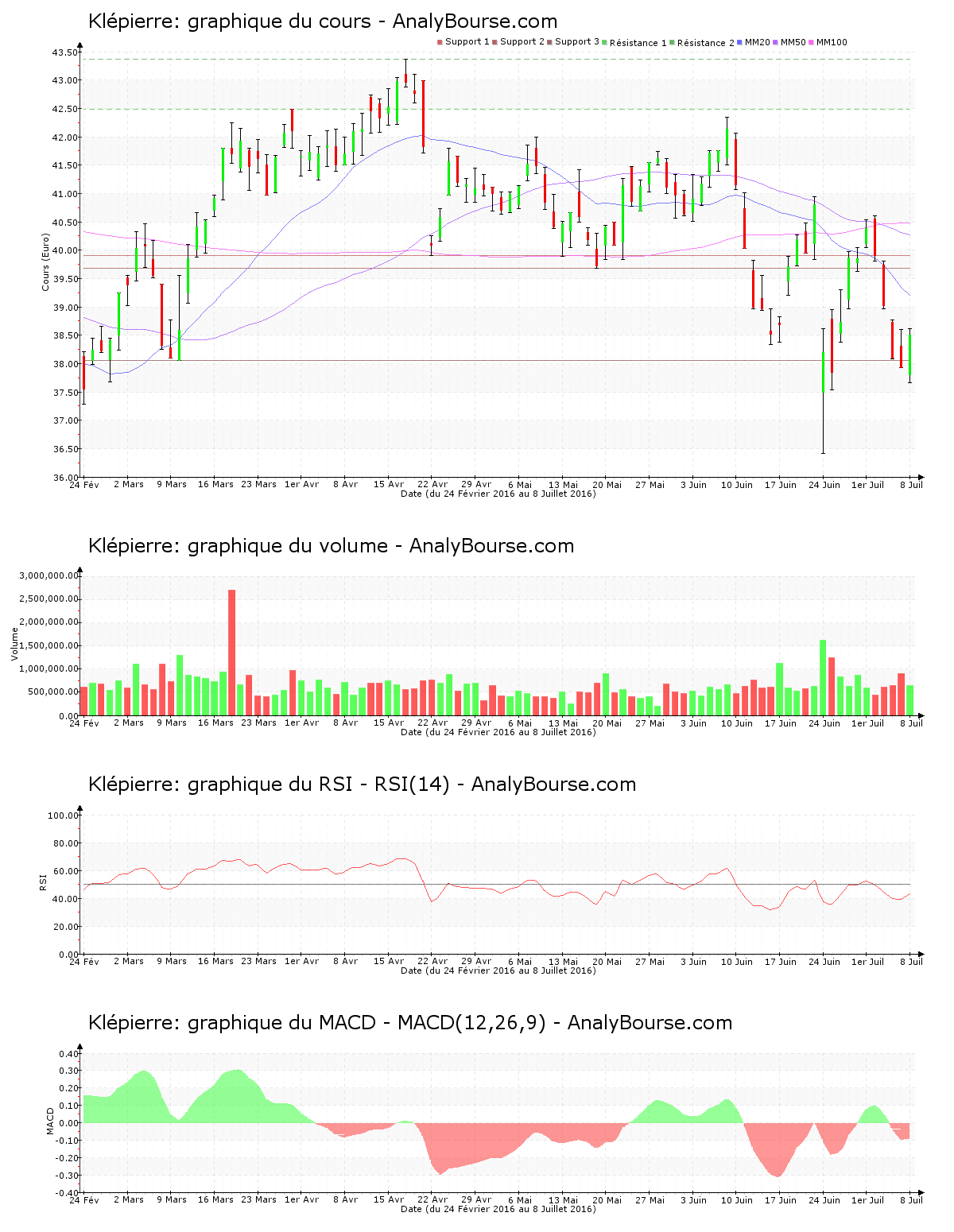 Pour les indicateurs, la moyenne mobile sur cinquante jours de l’action Klépierre se situe en deçà de sa moyenne mobile sur cent jours depuis lundi dernier. La moyenne mobile sur vingt jours de la valeur Klépierre se situe en deçà de la moyenne mobile sur cinquante jours, et la moyenne mobile sur cinquante jours se place elle-même en deçà de la moyenne mobile sur cent jours. Sur une longue période, l’action exprime ainsi un mouvement en baisse. La moyenne mobile sur vingt jours de la valeur Klépierre se situe à présent en deçà de sa moyenne mobile sur cinquante jours depuis 40 séances. On remarque que l’indicateur RSI est en décroissance cette semaine. C’est dorénavant au niveau de vente qu’il se positionne. Enfin, on constate que ces dernières séances l’indicateur MACD est en substantielle régression. C’est finalement une trajectoire du cours en grande régression que ce dernier dévoile à moyen terme. L’indicateur MACD a basculé en terrain négatif mercredi dernier, ceci peut esquisser un départ d’une évolution baissière sur une longue période pour Klépierre.