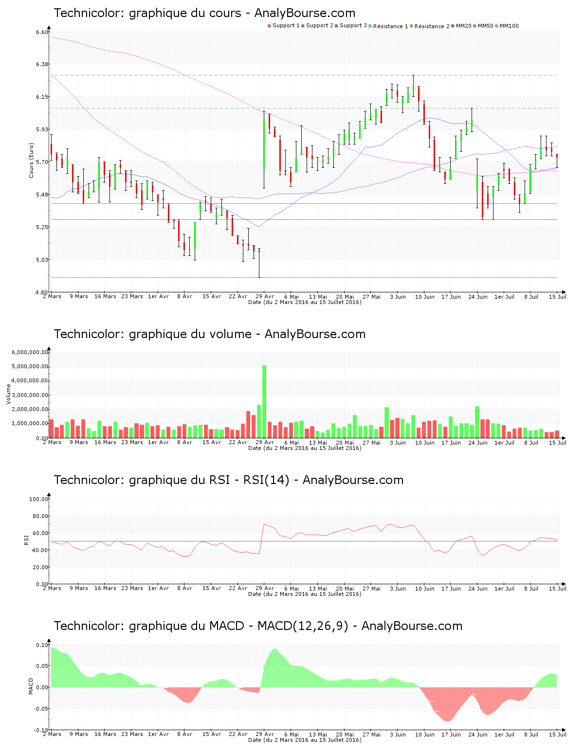 Avec un cours haussier de 1.24%, l’action Technicolor est en augmentation ces cinq derniers jours. Cette dernière se revend désormais à 5.730 €. Le résultat était neutre la semaine dernière pour Technicolor, avec un comportement haussier de 0.35%. L’action reprend par conséquent son développement haussier.