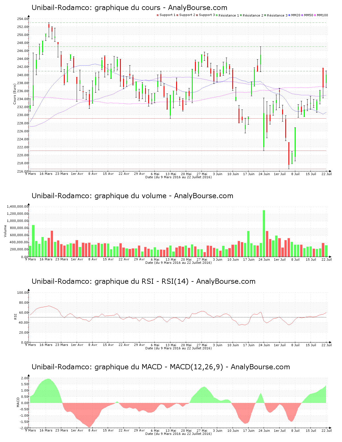 Ces informations constituent une analyse technique de l’action Unibail-Rodamco au samedi 23 juillet 2016. Cette analyse peut être invalidée par des éléments plus récents, et ne constitue en aucune manière une incitation d’achat ou de vente sur les marchés financiers. Le lecteur reste libre et responsable de l’interprétation et de l’usage faits de ces informations.