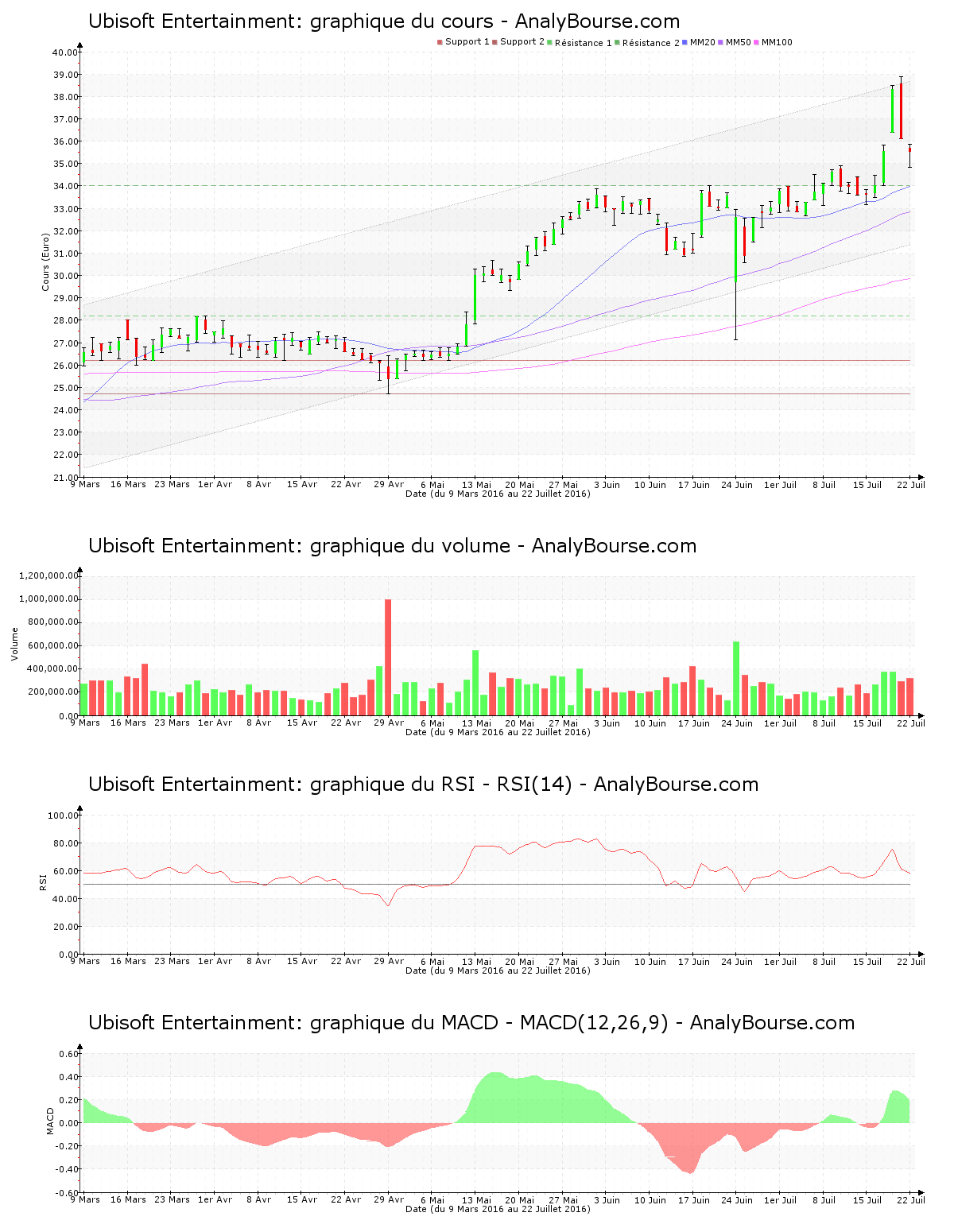Concernant les indicateurs, en ce qui concerne le RSI, on repère qu’il est relativement stable ces cinq derniers jours. C’est donc toujours dans le niveau d’achat qu’il se situe. De son côté, on relève que le MACD est en vigoureuse augmentation ces cinq dernières séances de cotations. Ce dernier signale finalement une évolution du titre en grande progression à court-moyen terme. Mardi dernier, l’indicateur MACD est passé en secteur positif, cela pourrait montrer un prélude d’une orientation en hausse sur le long terme pour Ubisoft Entertainment. Pour terminer, la moyenne mobile sur 20 jours de la valeur Ubisoft Entertainment se positionne au-delà de la moyenne mobile sur 50 jours, qui se situe elle-même au-delà de la moyenne mobile sur 100 jours. Sur le long terme, l’action montre ainsi un développement haussier. Depuis désormais 49 jours de cotations, la moyenne mobile sur 20 jours de l’action Ubisoft Entertainment se localise au-delà de sa moyenne mobile sur 50 jours.