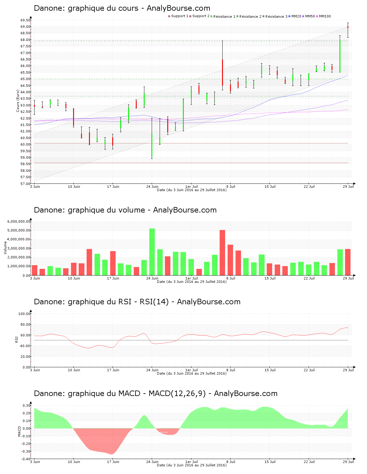 La valeur Danone est en ferme hausse ces derniers jours, avec un cours en progression de 5.32%. Elle se revend dorénavant à 68.880 €. Avec un développement baissier de 0.52%, le constat était neutre la semaine dernière pour Danone. Le mouvement croissant reprend par conséquent ces cinq derniers jours de cotations. Le cours a dépassé la résistance des 67.890 € cette semaine. L’action se situe proche de la limite supérieure du canal dans lequel cette dernière s’enclave depuis quelques temps. Depuis le lundi 13 juin 2016, moment de son entrée dans le canal, la valeur a gagné 13.91%.