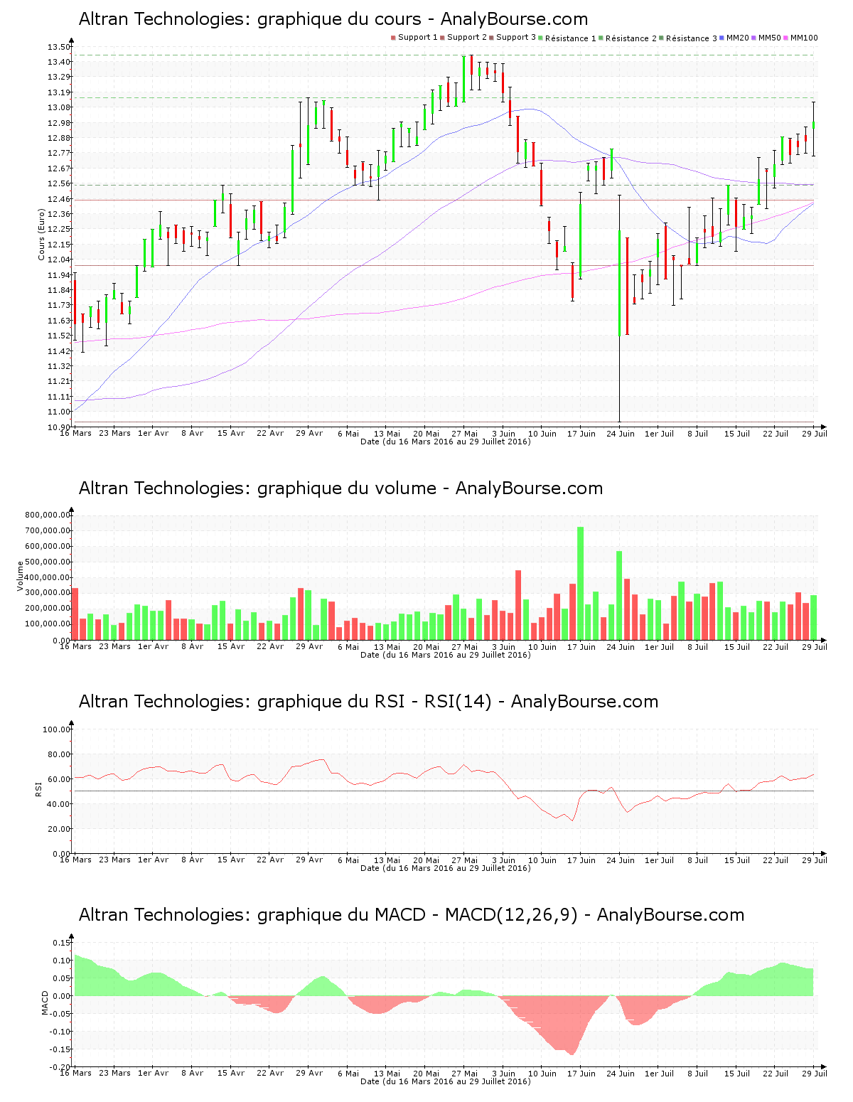 Côté indicateurs, le RSI est ces cinq derniers jours de cotations assez stable. C’est donc encore au niveau d’achat que ce dernier se situe. De son côté, l’indicateur MACD est stable cette semaine. Il représente par conséquent encore une trajectoire du titre en substantielle hausse sur le moyen terme. Pour terminer, la moyenne mobile sur cinquante jours de la valeur Altran Technologies se trouve maintenant au-dessus de sa moyenne mobile sur cent jours depuis 67 séances.