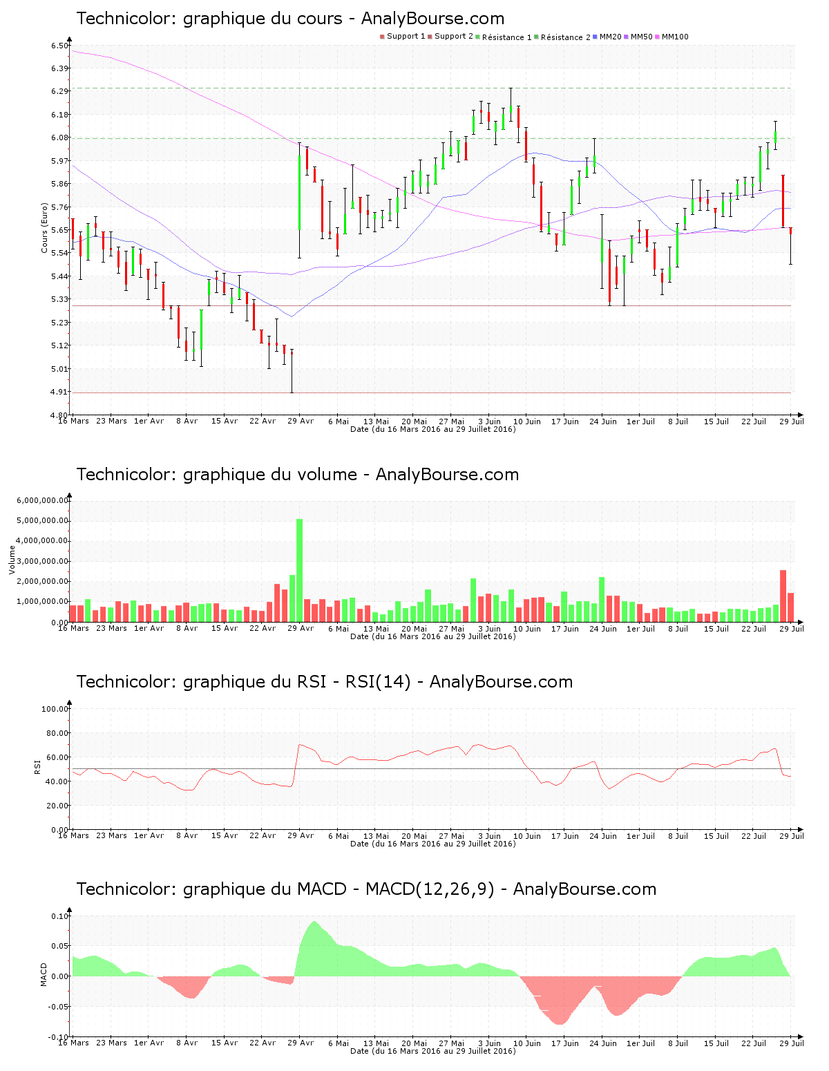 Côté indicateurs, on note que ces cinq dernières séances le RSI est en régression. C’est finalement dans le niveau de vente que ce dernier se trouve. Ensuite, pour le MACD, on note qu’il est en régression ces derniers jours. C’est à présent une trajectoire du cours relativement stable qu’il indique sur le moyen-court terme. L’indicateur MACD a basculé en terrain négatif vendredi dernier, cela peut ébaucher une base de tendance en décroissance à long terme pour Technicolor. Pour finir, voici à présent 34 séances que la moyenne mobile sur 50 jours de la valeur Technicolor se localise au-delà de sa moyenne mobile sur 100 jours.