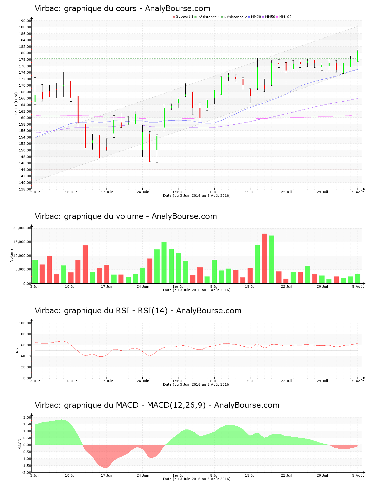 L’action Virbac subit ces dernières séances une pression acheteuse, représentée par un comportement haussier de 2.41%. Elle se valorise dorénavant à 180.450 €. Le parcours était neutre la semaine dernière pour Virbac, avec un comportement haussier de 0.92%. L’action reprend ainsi son parcours en croissance. Le titre a franchi la résistance des 178.300 € cette semaine. L’action se localise au milieu du canal à l’intérieur duquel elle se développe depuis quelques temps.