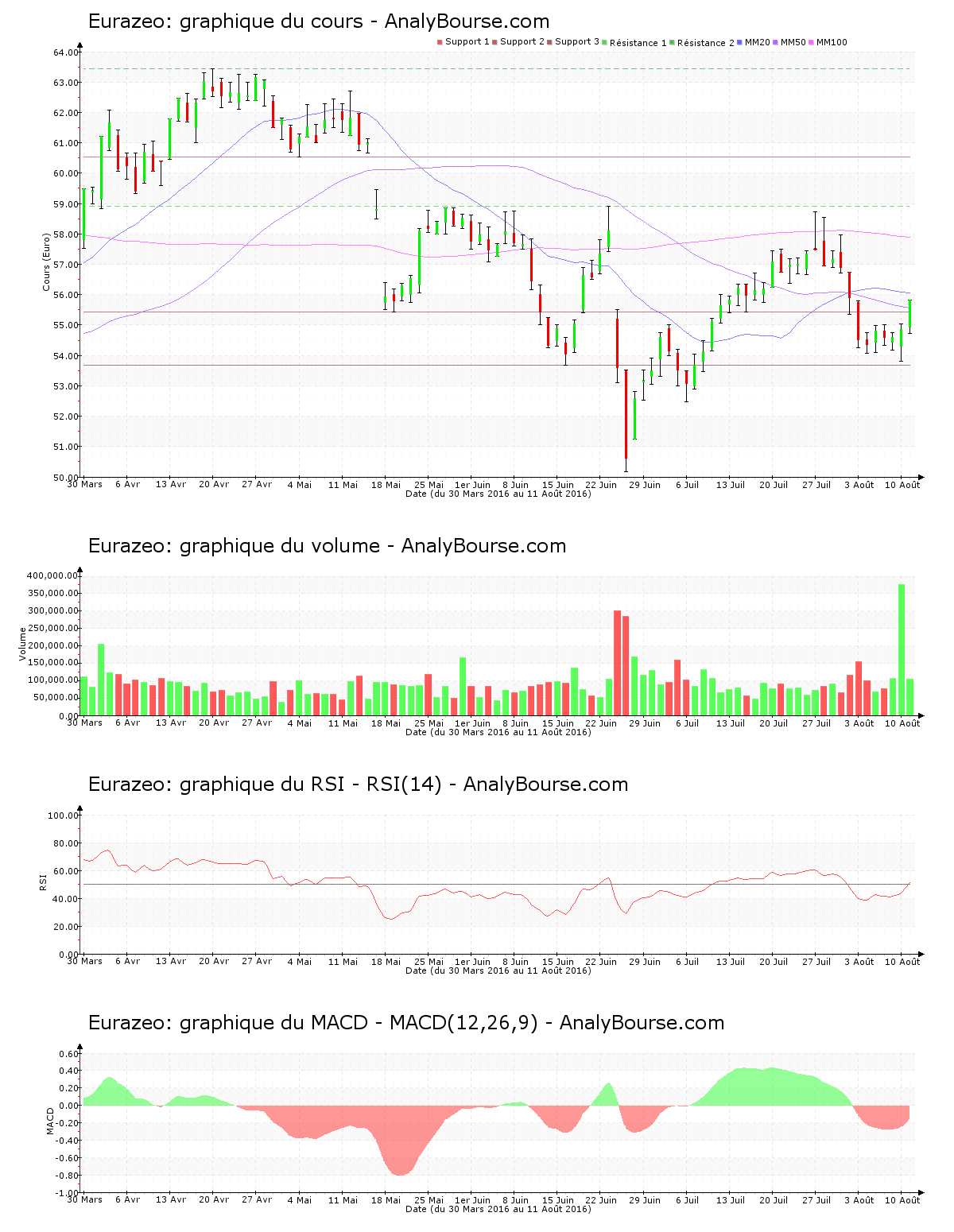 Concernant l’indicateur MACD, on remarque qu’il est en importante augmentation ce jeudi 11 août. C’est néanmoins encore une trajectoire du titre en grande décroissance que ce dernier indique à moyen terme. On observe qu’aujourd’hui l’indicateur RSI est en progression. Il est passé au niveau d’achat, ce qui pourrait révèler un départ d’une trajectoire en progression sur le long terme pour l’action Eurazeo.