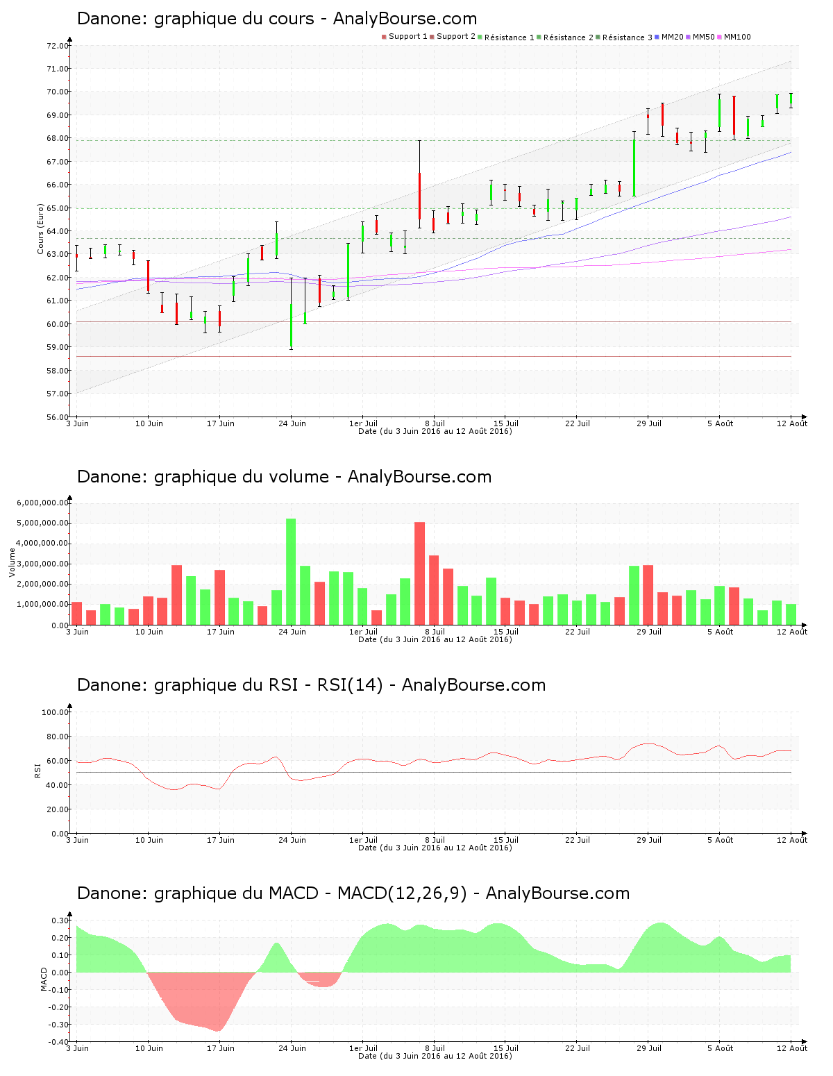 |L’action Danone s’apprécie faiblement ces dernières séances, avec un cours haussier de 0.37%. Débutant à 69.640 € pour arriver à 69.900 € ces derniers jours, cette dernière croît un peu en effet juste de 0.260 €. Incarnée par un mouvement haussier de 1.10%, la demande sur Danone la semaine dernière était au contraire bien présente. L’action se localise au milieu du canal à l’intérieur duquel cette dernière s’enferme depuis un certain temps.