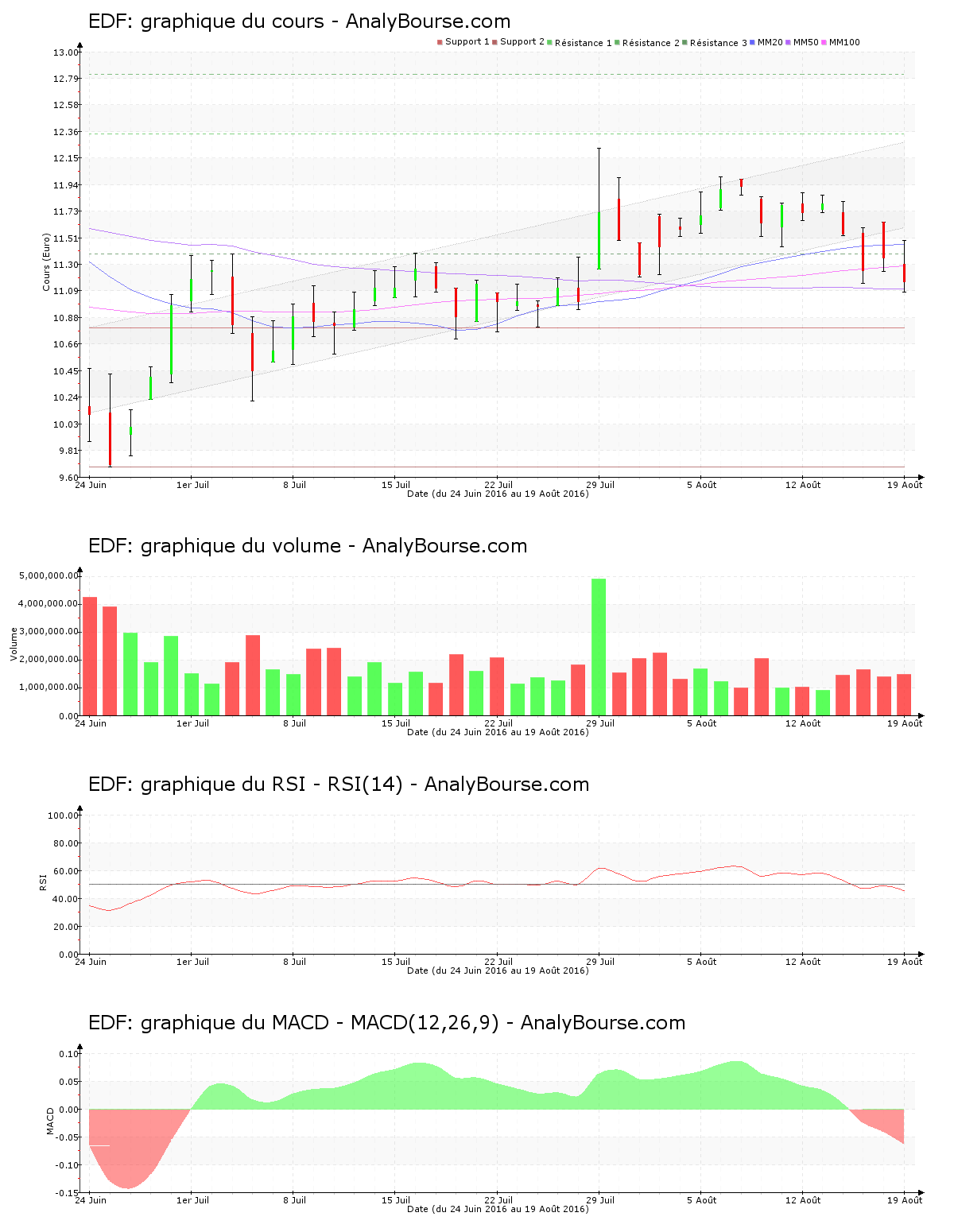 En ce qui concerne les indicateurs, on observe que ces derniers jours le MACD est en solide diminution. C’est à présent une tendance du cours en grande décroissance qu’il suggère à court-moyen terme. Mercredi dernier, le MACD a basculé du côté négatif, ceci peut représenter une amorce de tendance baissière sur une longue période pour EDF. L’indicateur RSI est ces cinq derniers jours en diminution. Ce dernier se positionne maintenant au niveau neutre.