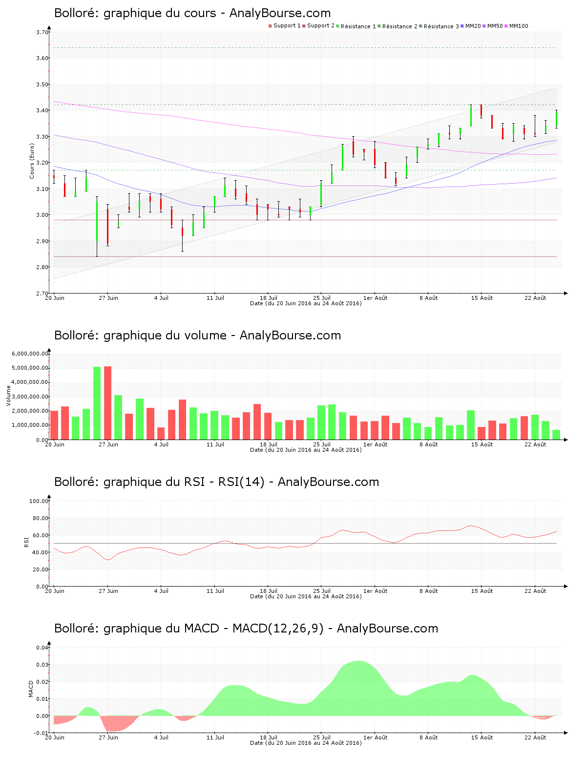 Pour les indicateurs, pour l’indicateur MACD, on observe que ce dernier est plutôt stable ce jour. L’indicateur MACD est passé du côté positif ce mercredi 24 août, ceci pourrait signaler un prémice d’une trajectoire en augmentation à long terme pour l’action Bolloré.