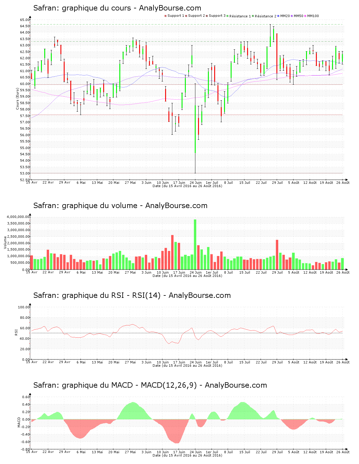Pour les indicateurs, on remarque que l’indicateur RSI est en augmentation ces derniers jours. C’est désormais dans le niveau neutre qu’il se situe. De son côté, on note que le MACD est en substantielle hausse ces cinq dernières séances de cotations. C’est dorénavant une évolution du cours assez stable que ce dernier révèle à moyen-court terme. L’indicateur MACD est passé en terrain positif mercredi dernier, ce qui pourrait montrer un commencement d’une trajectoire haussière à long terme pour Safran. Pour finir, la moyenne mobile sur 20 jours de l’action Safran se positionne au-dessus de la moyenne mobile sur 50 jours, qui se localise quant à elle au-delà de la moyenne mobile sur 100 jours. A long terme, l’action présente donc un mouvement en hausse. La moyenne mobile sur 50 jours de la valeur Safran se trouve dorénavant au-delà de sa moyenne mobile sur 100 jours depuis 87 séances.