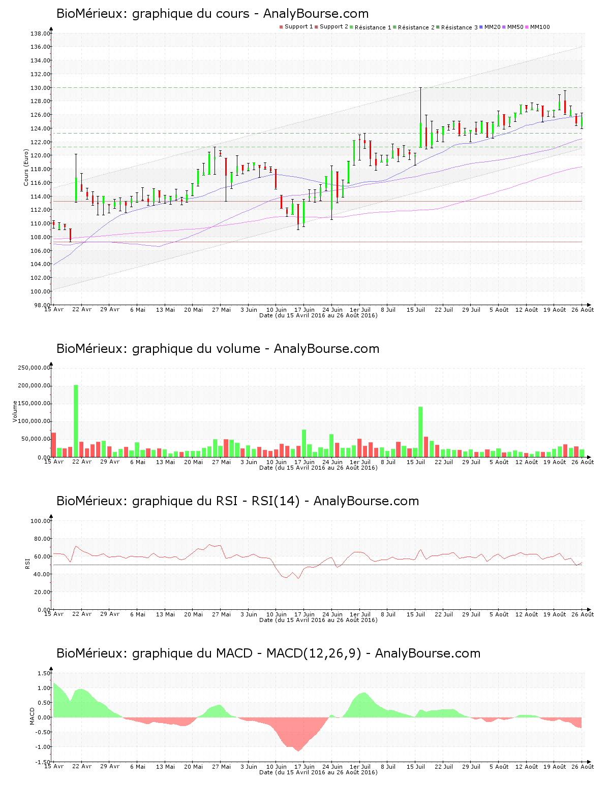 Côté indicateurs, la valeur BioMérieux possède une moyenne mobile sur vingt jours située au-dessus de sa moyenne mobile sur cinquante jours, qui est elle-même positionnée au-delà de sa moyenne mobile sur cent jours. L’action traduit donc un développement croissant à longue échéance. La moyenne mobile sur vingt jours de la valeur BioMérieux se localise à présent au-delà de sa moyenne mobile sur cinquante jours depuis 90 séances. Ensuite, on observe que ces cinq derniers jours de cotations le MACD est en conséquente décroissance. Il caractérise maintenant une évolution du titre en vigoureuse décroissance sur le moyen-court terme. Enfin, le RSI est cette semaine assez stable. C’est ainsi toujours au niveau neutre qu’il se place.