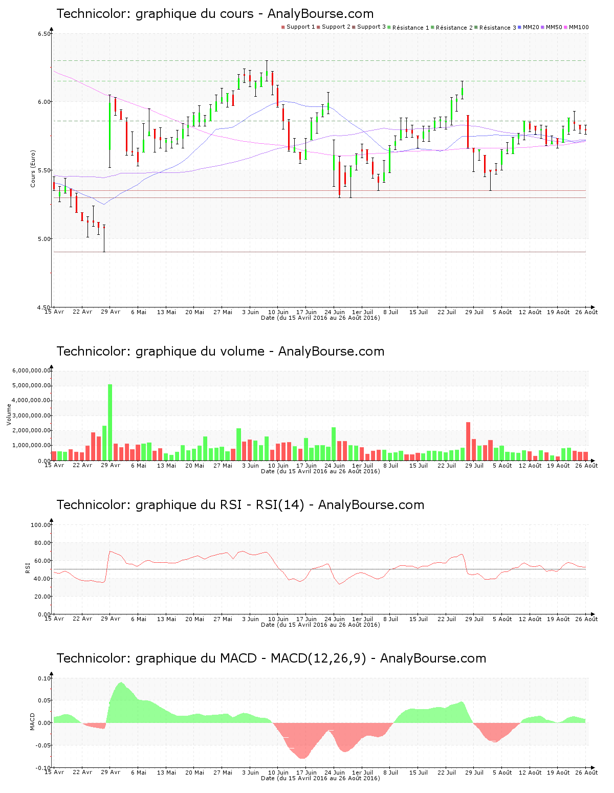 Pour les indicateurs, l’indicateur MACD est ces dernières séances stable. C’est par conséquent toujours une trajectoire du cours stable qu’il suggère à court-moyen terme. La moyenne mobile sur 20 jours de la valeur Technicolor se situe en-dessous de sa moyenne mobile sur 50 jours depuis mardi dernier. Depuis finalement 54 jours de cotations, la moyenne mobile sur 50 jours de la valeur Technicolor se trouve au-delà de sa moyenne mobile sur 100 jours. Pour terminer, l’indicateur RSI est ces dernières séances en hausse. C’est finalement dans le niveau neutre qu’il se place.