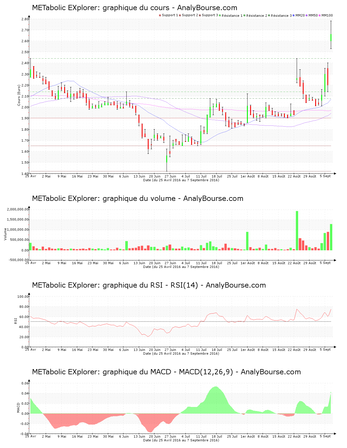 METabolic EXplorer flambe aujourd’hui, avec un cours en croissance de 20.91%, avec approximativement 1.3 million de titres échangés à 09:40. L’action atteint finalement la cotation de 2.660 €. METabolic EXplorer était à l’inverse en ferme baisse hier, avec un parcours baissier de 4.35%. L’évolution s’inverse donc de manière importante ce jour. Le cours a passé la résistance des 2.440 € ce mercredi 7 septembre. Relevons, avec un pourcentage de 9.88% écartant ce mercredi 7 septembre les extrêmes, une agitation manifeste sur la valeur. Le titre a connu aussi un gap à la hausse de 18.18% à l’ouverture des marchés, METabolic EXplorer entamant la séance à 2.600 €.